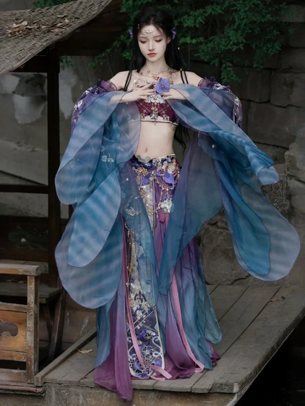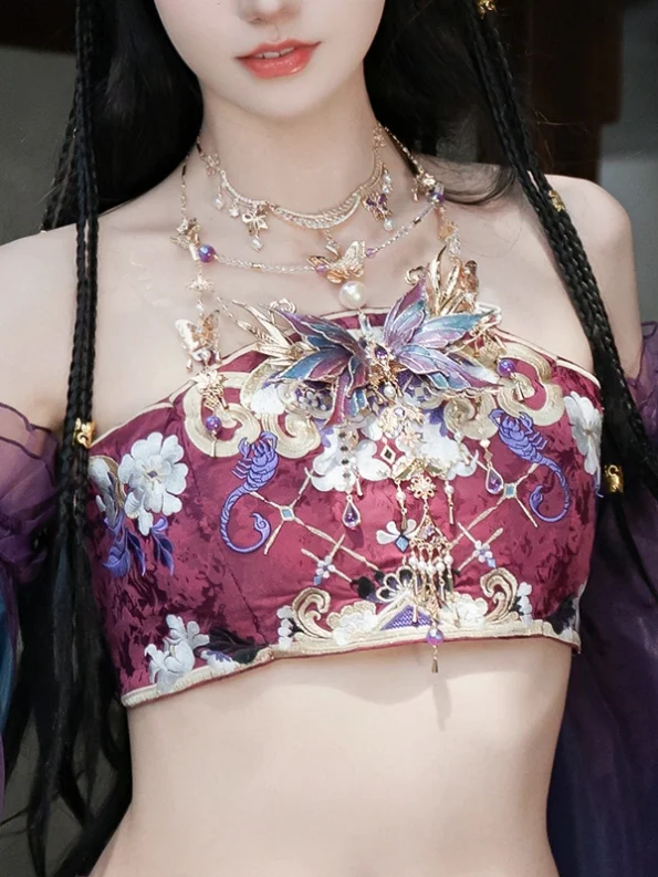 Dette elegante Hanfu-sæt er inspireret af de nordlige og sydlige dynastier og består af en yndefuld Qiyao-nederdel kombineret med udsøgt broderi. De fine broderede mønstre tilføjer et strejf af renhed og elegance, mens de brede ærmer er designet til at være åndbare og luftige - perfekte til forårs- og sommerbrug. Den flydende nederdel skaber en luksuriøs og æterisk silhuet, der er ideel til daglig brug, kulturelle begivenheder eller sceneoptræden.