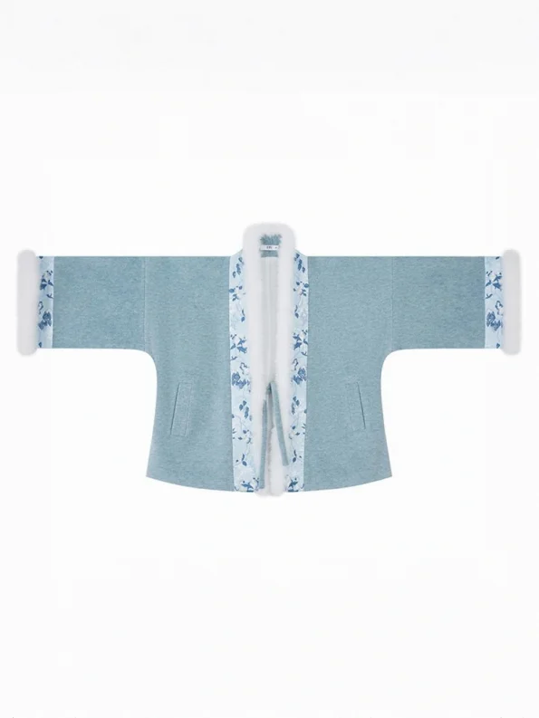 Ini Dinasti Song bersulam Jaket pendek Hanfu dengan warna biru yang elegan dirancang untuk musim gugur dan musim dingin, memadukan kehangatan dengan kehalusan tradisional. Jaket ini memiliki struktur dua lapis: kain luarnya terbuat dari poliester, akrilik, dan benang metalik, sedangkan lapisan dalam dan trim bulunya terbuat dari poliester 100%. Jaket ini tidak mengandung wol. Detail bordir dan jacquard pada saku rok dan manset, serta hiasan bulu dekoratif, meningkatkan kehangatan dan keanggunan. Ideal untuk pakaian sehari-hari, festival, dan acara-acara budaya.