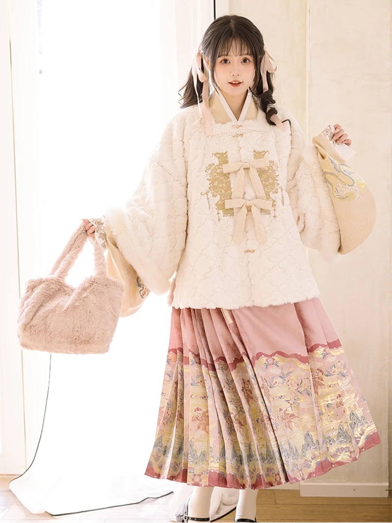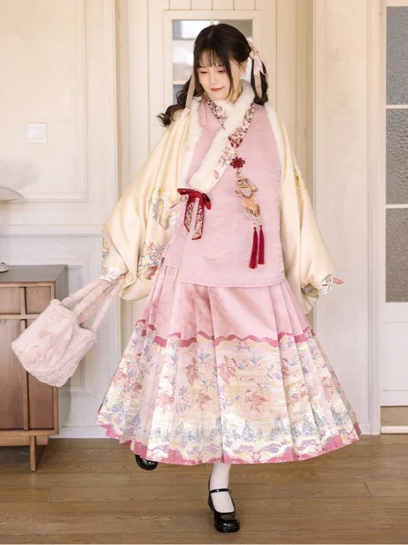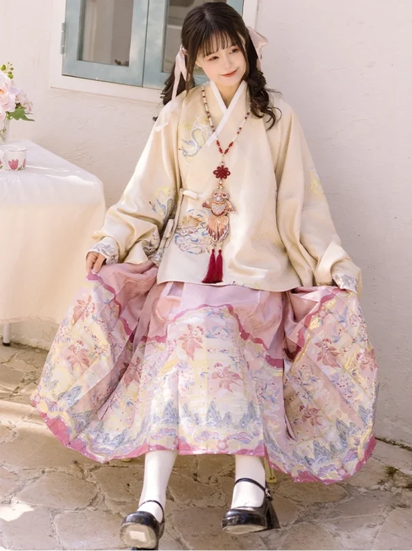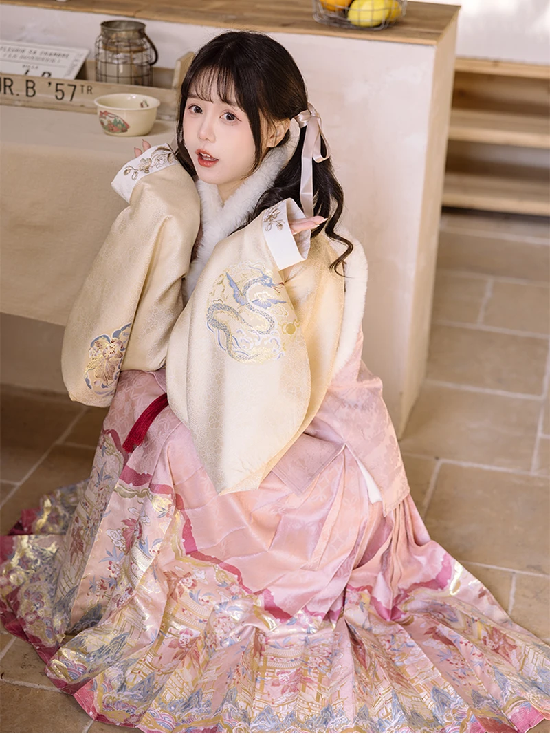 Dinasti Ming Hanfu Brokat Emas Tari Yulong Midi Mamian Qun