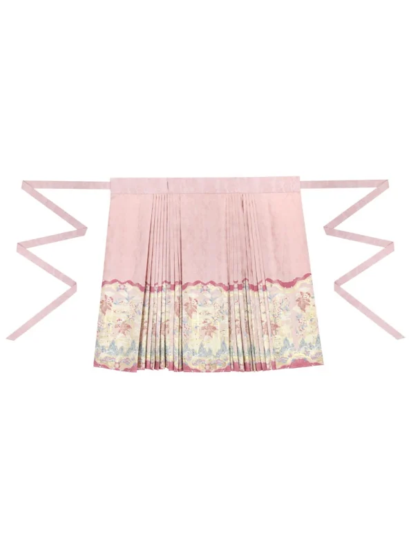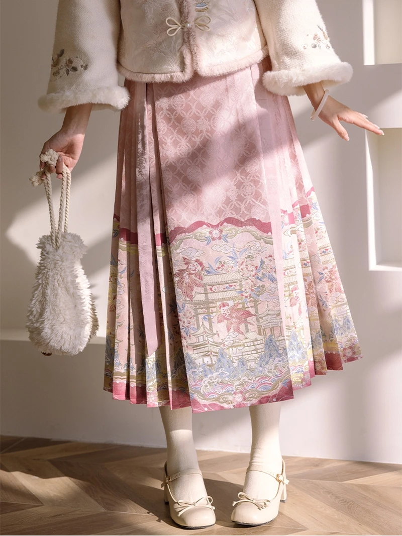 Ini brosur emas Mamian Qun menampilkan tenun jacquard yang sangat indah dengan detail berkilauan yang berkilauan seperti air yang beriak di bawah sinar matahari. Desain rok ini menggabungkan gunung, sungai, istana, ikan mas, dan motif bunga klasik, melukiskan pemandangan kemakmuran dan pergerakan yang jelas - penggambaran simbolis dari “Ikan Melompati Gerbang Naga (鱼跃龙门)”.