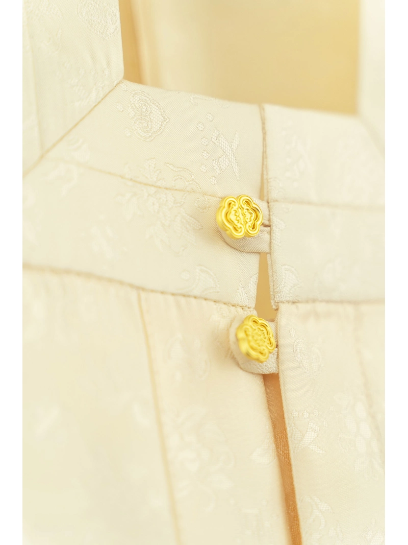 Realizzato in tessuto jacquard satinato con motivi Mixed Treasures e Small Floral Medallion, questo gilet è robusto, strutturato e ricco di fascino d'epoca. Le fibbie in lega a forma di Ruyi sul davanti offrono un fascino decorativo e un'artigianalità tradizionale. Progettato con una vestibilità ampia e di medio spessore, è ideale per le rievocazioni storiche, gli eventi Hanfu o i collezionisti di abiti in stile Ming.