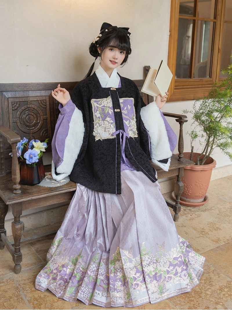 その 明代 Hanfu秋冬錦マミアンスカートセットは、精巧な職人技と考え抜かれた重ね着によって、明時代のファッションの洗練されたエレガンスを表現している。