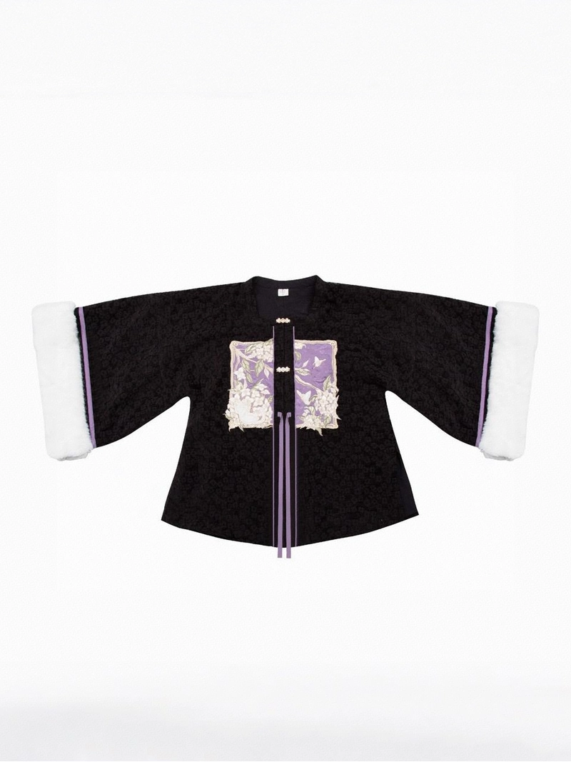 アウター・ローブはスクエアカラーの半袖ブジ・スタイルで、花柄のウール混紡生地で作られている。刺繍ワッペンは、インナーシャツと同じパープルの生地でコントラストを効かせたアップリケ刺繍を施し、ワッペン内のネコのモチーフは、2層目のテクスチャー加工を施したウールのアップリケで表現することで、鮮やかで立体的な効果を生み出している。
