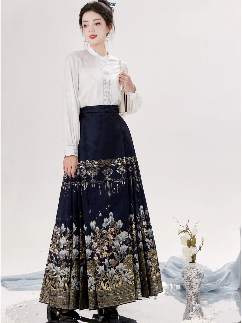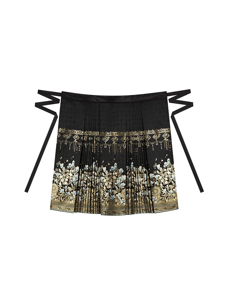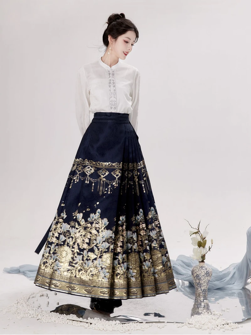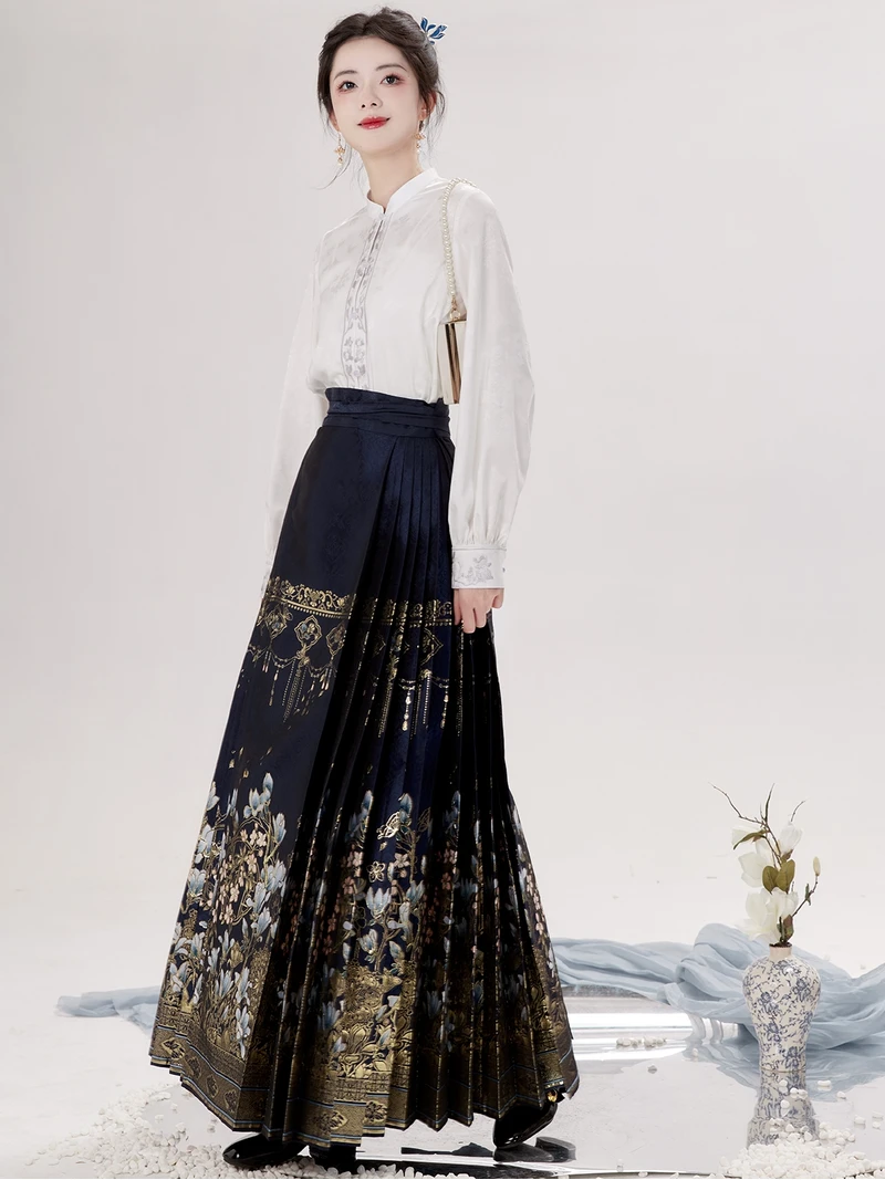 その マミアン・クン (马面裙、mǎ miàn qún) 豪華な3色から選べる見事な金糸入りブロケード生地が特徴です。 ティールブルー、エレガントブラック、チェリーレッド.
