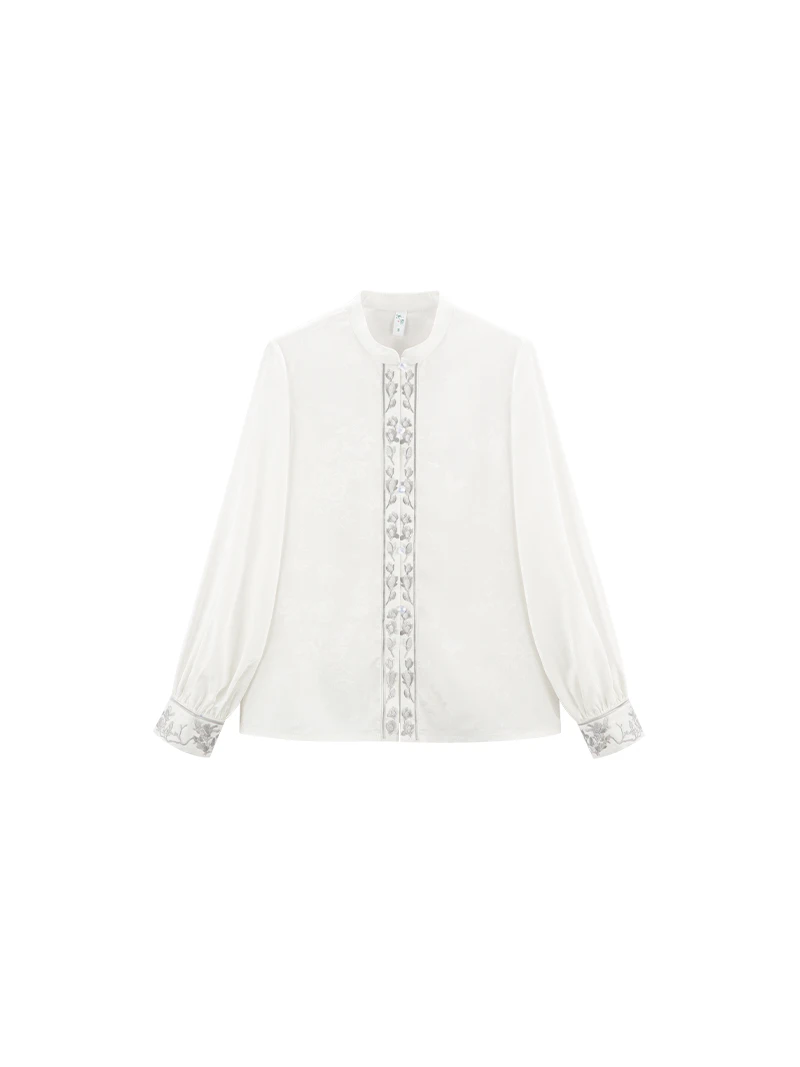その 漢式クロスカラーシャツ(对襟衬衫) 柔らかなサテンジャカード生地に、前立てと袖口に刺繍された木蓮のモチーフが洗練された気品を放ちます。.