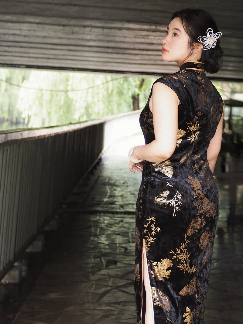 その 新中国風ブラックゴールド箔チパオドレス クラシックな気品とコンテンポラリーな魅力が調和しています。素材は ゴールドフォイル仕上げのアイスベルベット光の下で繊細にきらめき、洗練されたルックを演出する。