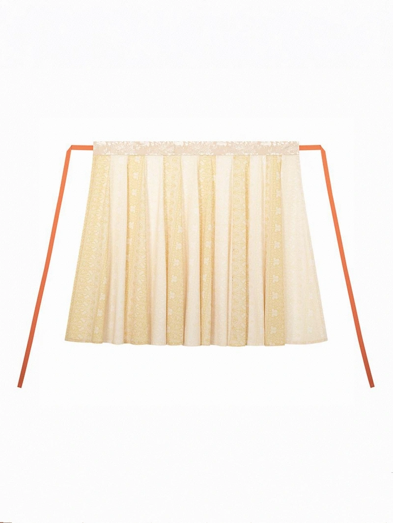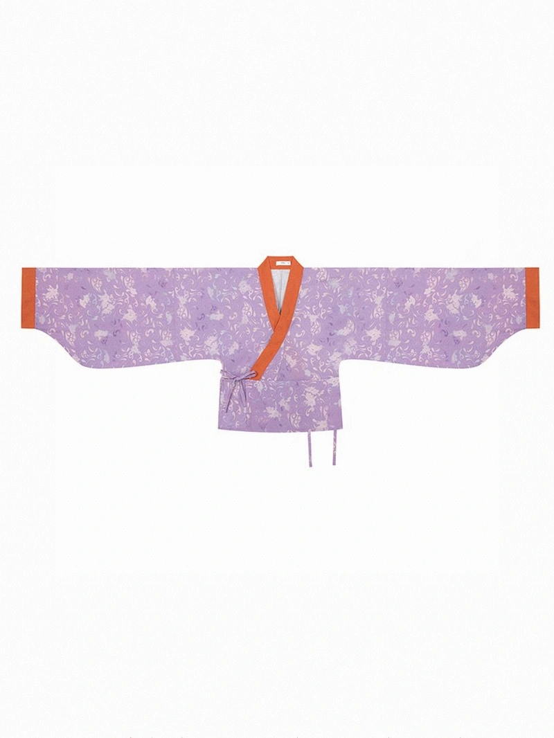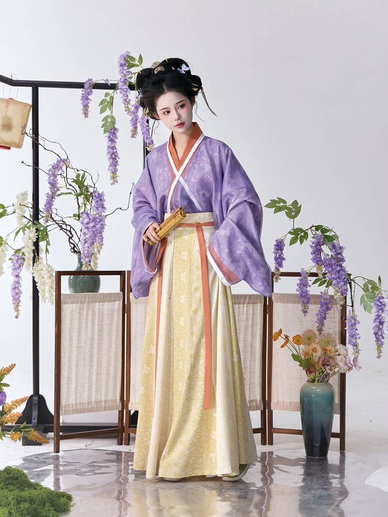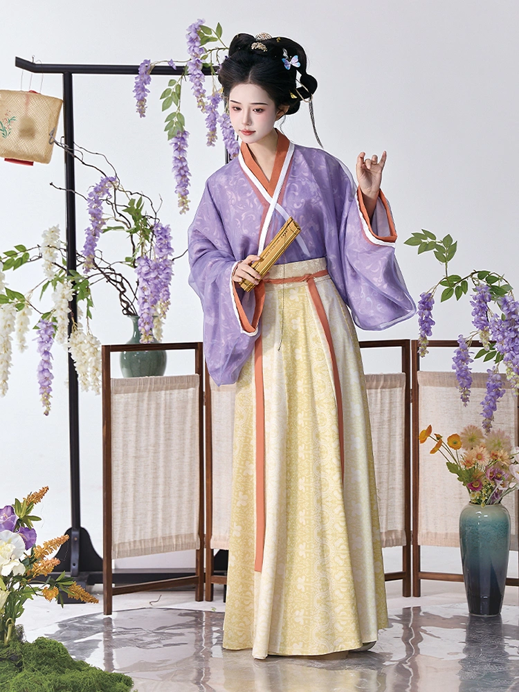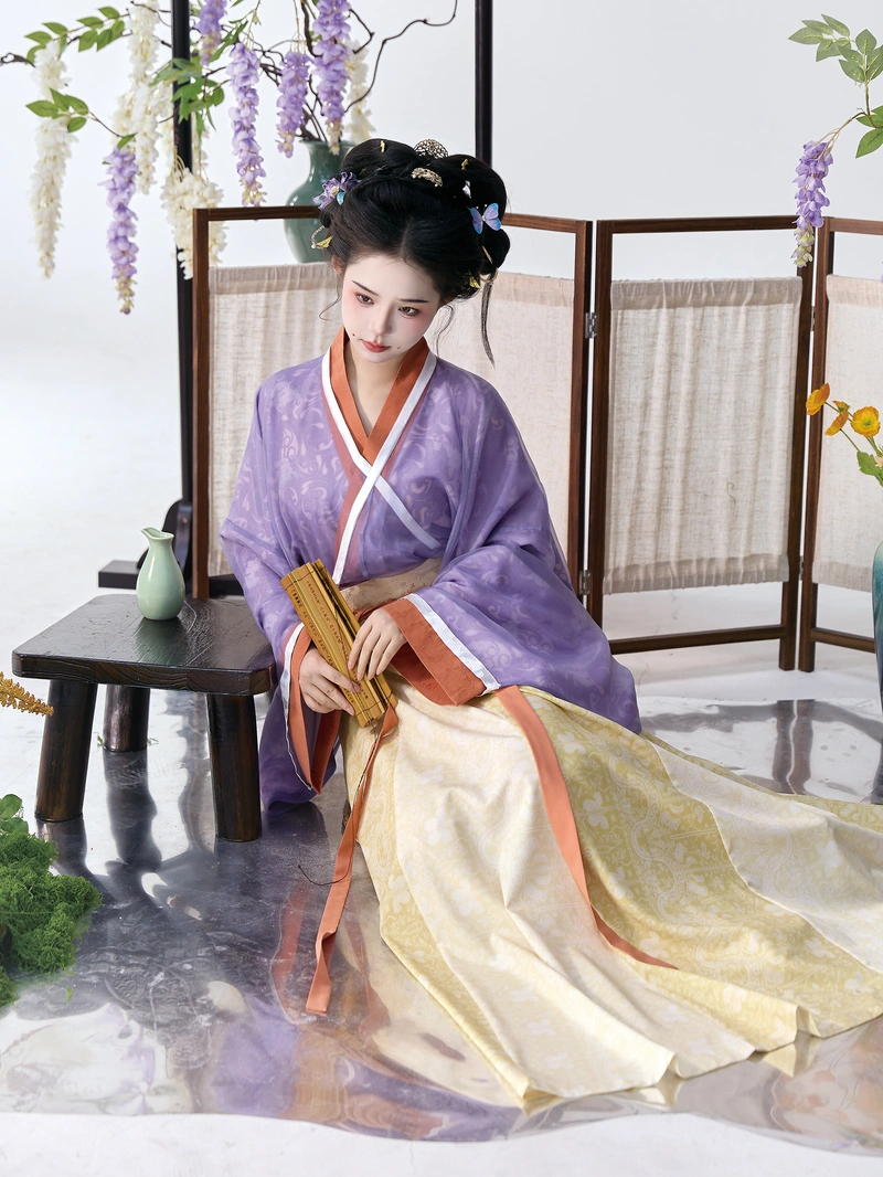 ini Dinasti Jin tradisional Hanfu set mempunyai reka bentuk Skirt Jiaoyu yang dipulihkan, ringan dan elegan, sesuai untuk pakaian musim bunga, musim panas dan musim luruh. Bahagian atas dalam berwarna ungu dihiasi dengan motif awan mengalir dan beraksen dengan manset merah bata untuk sentuhan klasik. Bahagian atas luar yang tipis berwarna ungu muda bernafas dan sedikit lut sinar, dengan kolar yang dipangkas putih yang mendedahkan lapisan dalam secara halus untuk kesan berlapis yang halus. Skirt Jiaoyu kuning-putih dipotong dalam siluet yang anggun, mengalir dan melangsingkan, menjelmakan keanggunan fesyen Dinasti Jin.