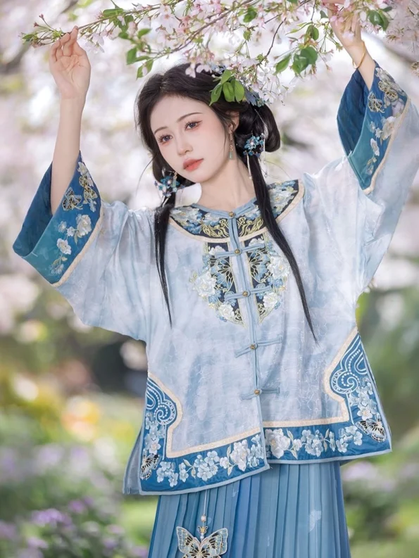 Ervaar de tijdloze charme van de Republiek China tijdperk met deze prachtige blauw geplooide rok set. Met delicate borduurwerk De set bestaat uit een prachtig ontworpen top met een klassieke ronde kraag en gekruiste voorkant, een comfortabel hemdje en een vloeiende plooirok. Gemaakt van zachte polyester stof is deze outfit perfect voor dagelijks gebruik of speciale gelegenheden, waarbij traditionele esthetiek wordt gecombineerd met modern comfort. De bijgeleverde vlinderaccessoire voegt een sierlijke finishing touch toe en maakt dit ensemble zowel elegant als uniek.