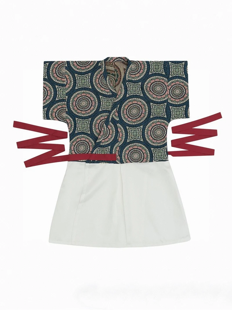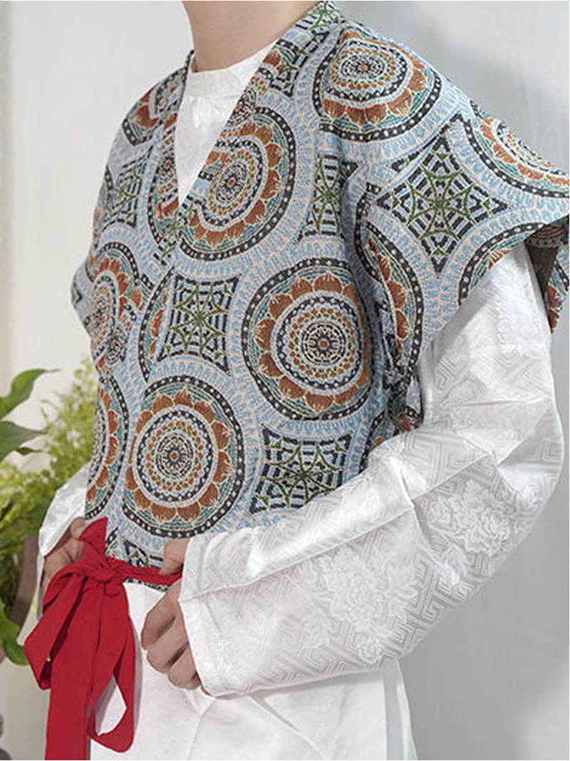 Deze Hanfu Banbi (bovenkleding met korte mouwen) in Tang-stijl heeft een klassiek ontwerp met een gekruiste kraag en een elegant geometrisch jacquardpatroon dat de verfijnde symmetrie en kunstzinnigheid van textielmotieven uit de Tang-dynastie laat zien.