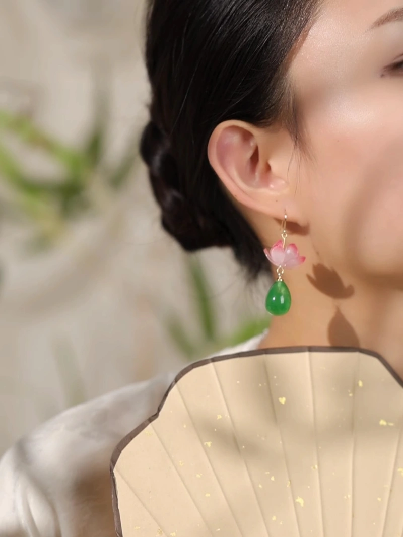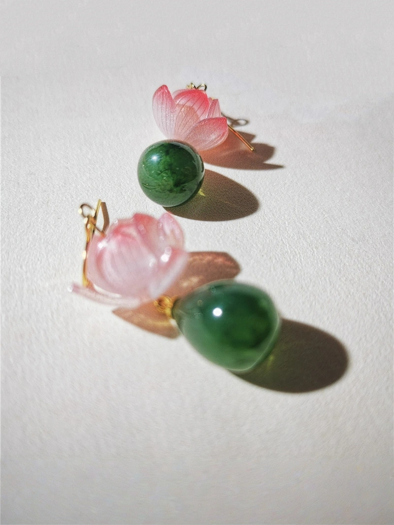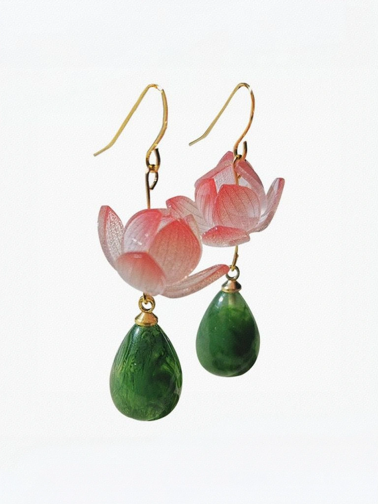 Embrace the elegance of traditional Chinese artistry with these Pink Lotus Flower Drop Earrings. Delicately handcrafted, each piece features a soft pink lotus blossom paired with a translucent green teardrop, capturing the essence of natural beauty and grace.