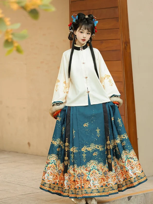 The mamian qun is crafted from jacquard fabric with subtle patterns, offering a beautiful texture and a soft sheen that enhances the overall elegance.