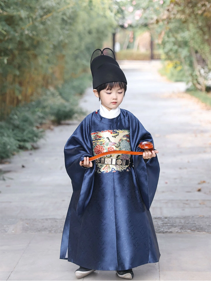 This Ming-style embroidered boys’ Yuanlingpao (Round Collar Robe) features patterns inspired by restored Ming Dynasty portraits, showcasing the rare First-Rank Crane Badge. The elegant crane symbolizes purity, longevity, and high status, surrounded by blooming floral motifs for added richness. Crafted with full gold flat embroidery, where slight thread direction variations are normal. Made of durable polyester, perfect for festivals, cultural events, photoshoots, or daily traditional wear.