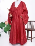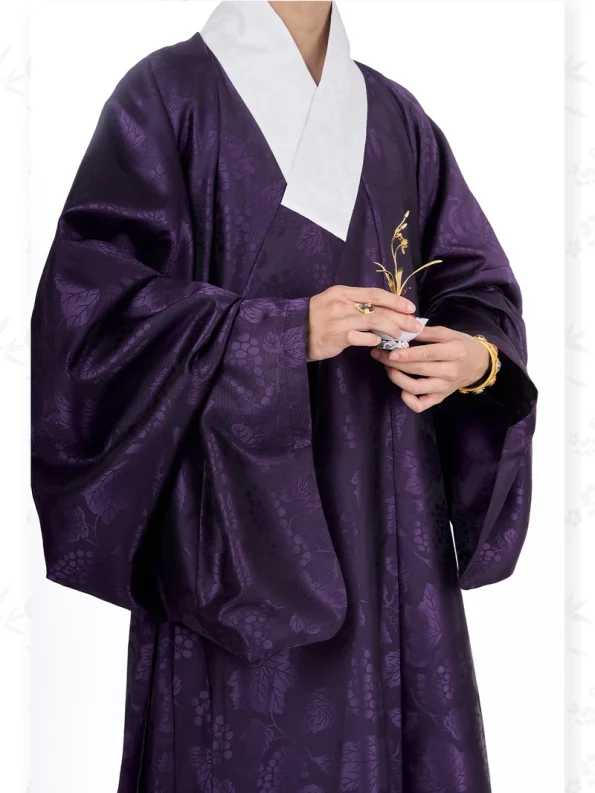 This Ming-style Hanfu Dao robe features a traditional cross-collar design with narrow sleeves, offering a simple yet elegant silhouette. Made from jacquard-style fabric with subtle grape patterns, it reflects understated refinement and classical charm. The long-length design makes it suitable for daily wear, cultural activities, or casual Hanfu styling.