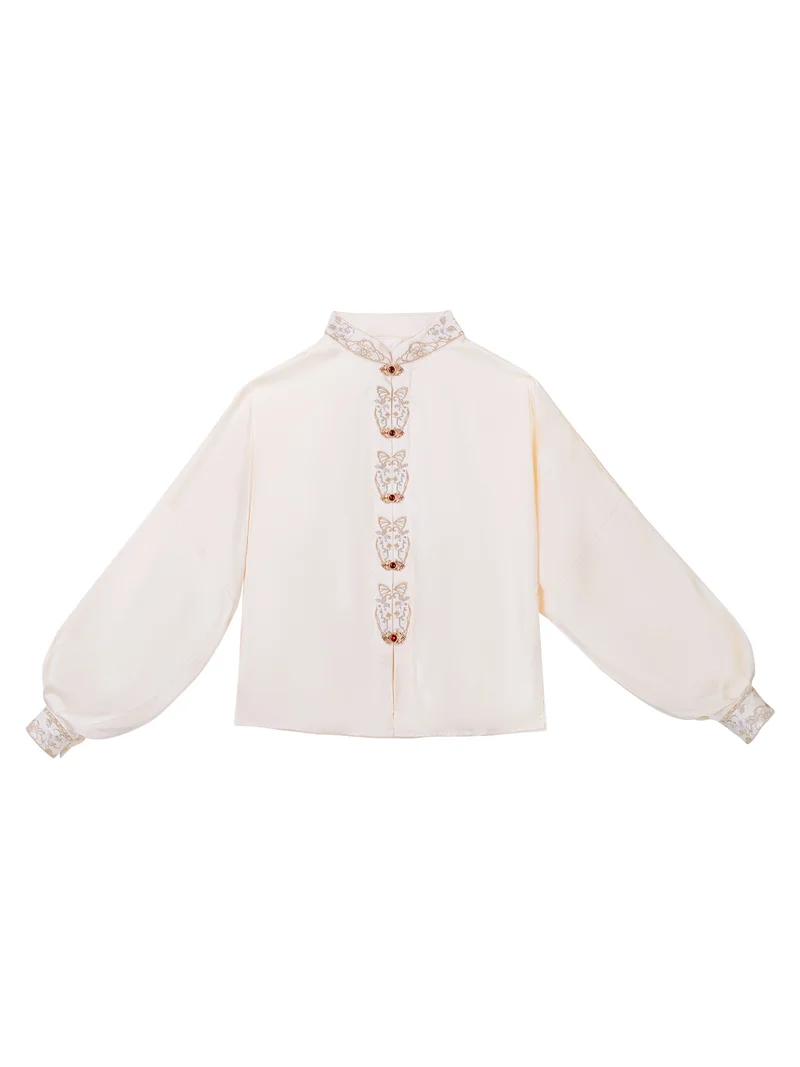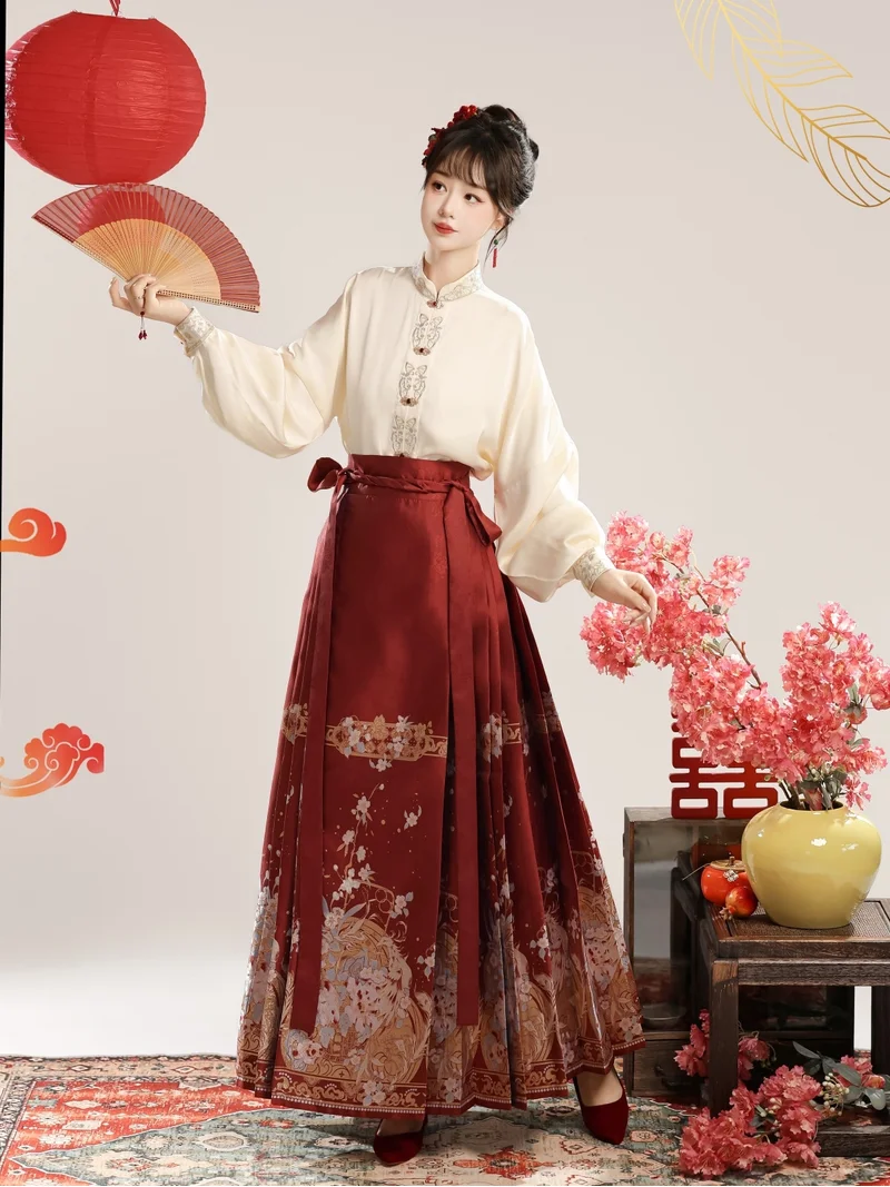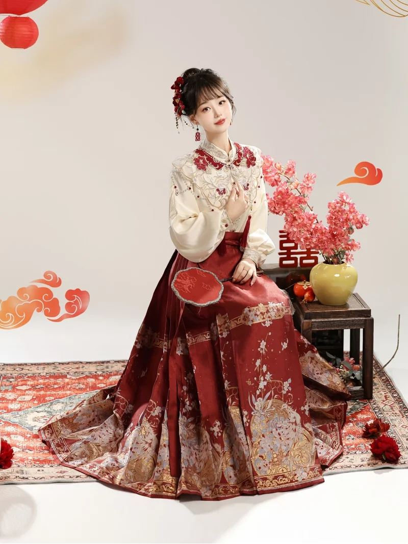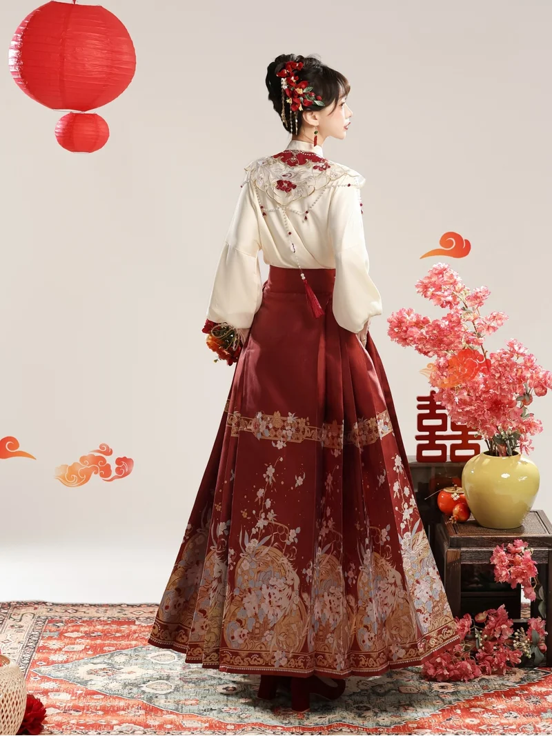 This New Chinese Style Hanfu set radiates festive elegance and cultural grandeur, perfect for weddings, engagement ceremonies, or traditional celebrations. The ensemble includes a Yunjian (embroidered cloud-shoulder shawl), a silky top, and a brocade Ma Mian Qun (horse-face skirt), forming a refined, regal silhouette inspired by ancient Chinese bridal attire.