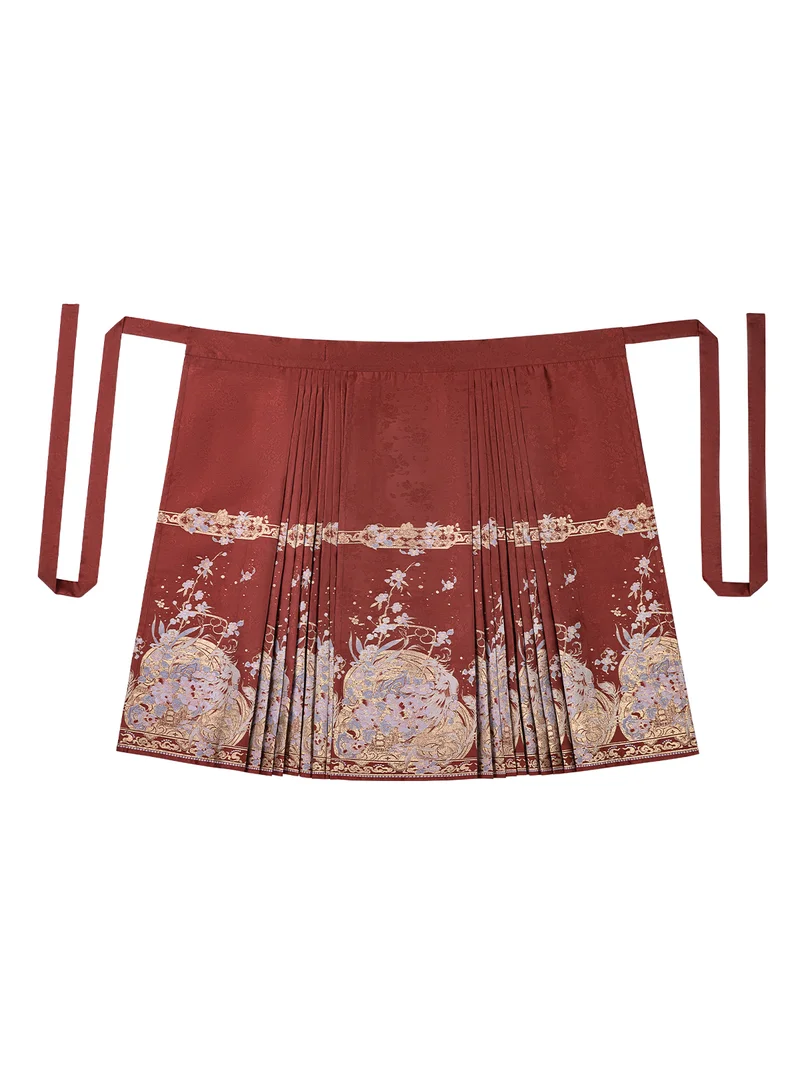 The Yunjian is crafted from delicate Ruyi-pattern sheer fabric, luxuriously embroidered with phoenix and floral motifs symbolising harmony and prosperity. The top is made from imitation acetate satin, offering a soft sheen and comfortable drape, while the Ma Mian Qun is woven from premium brocade fabric, rich in detail and texture.