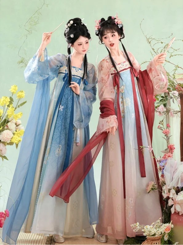 This Tang-style embroidered Hanfu set captures the elegance and grace of ancient Chinese beauty. Featuring a cross-front top, flowing Qixiong skirt, and a light chiffon shawl, it brings a soft, fairy-like charm perfect for spring and summer.