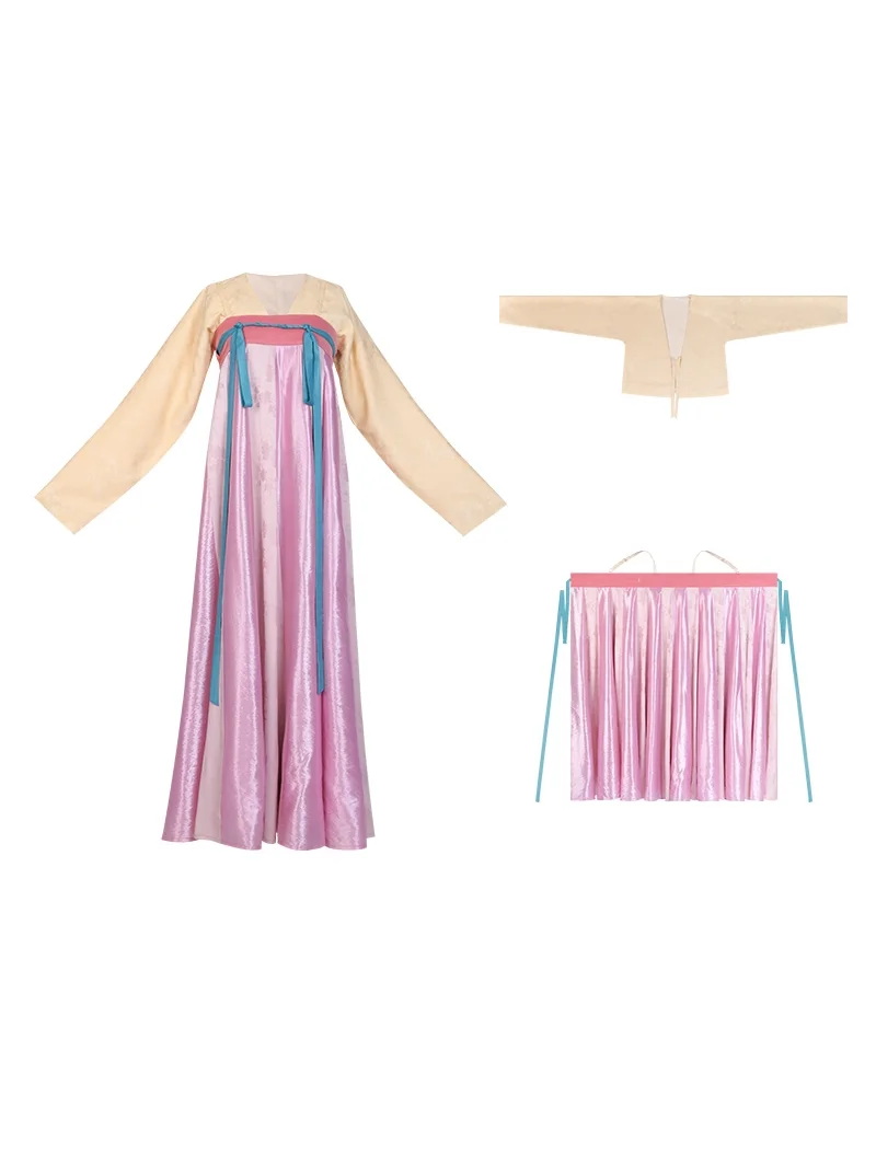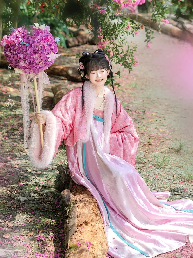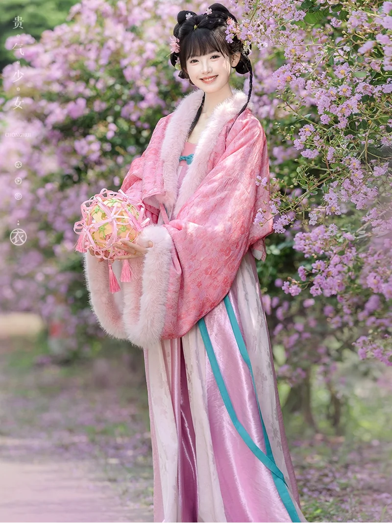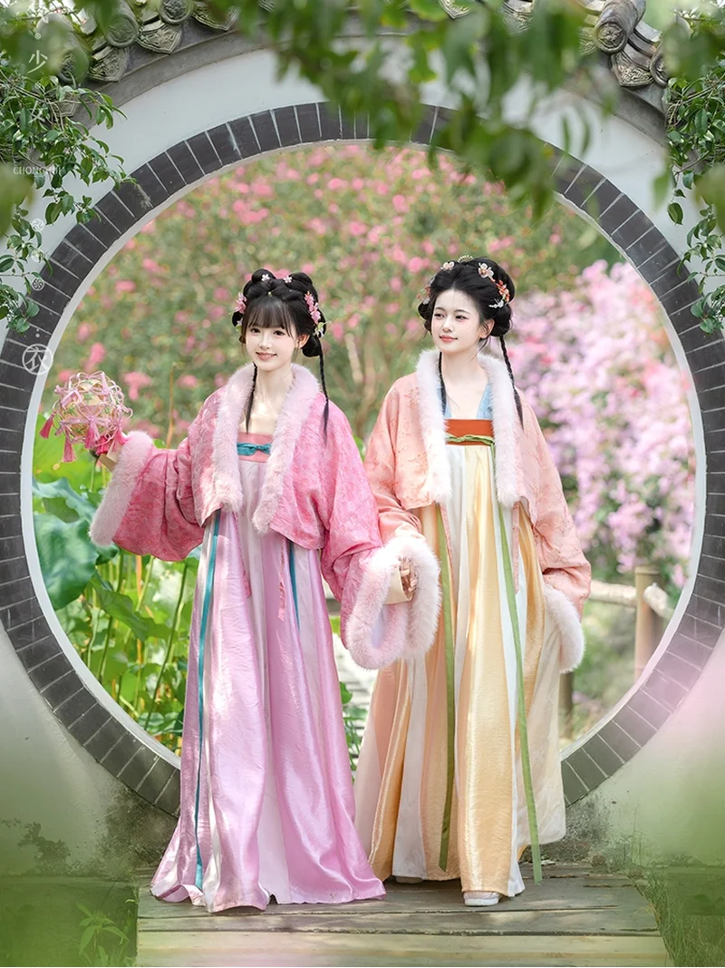 This elegant Tang-style Hanfu Qixiong Ruqun (chest-high Ruqun) set is designed for autumn and winter, blending historical refinement with warmth and comfort. The ensemble includes a Zhilin Duijin Ao (Straight-Collar Cross-Front Top), a sixteen-panel Qixiong Ruqun skirt, and a Famen Temple Pi’ao (Outer Robe) — each made from luxurious fabrics that recreate the grace of Tang-era attire.