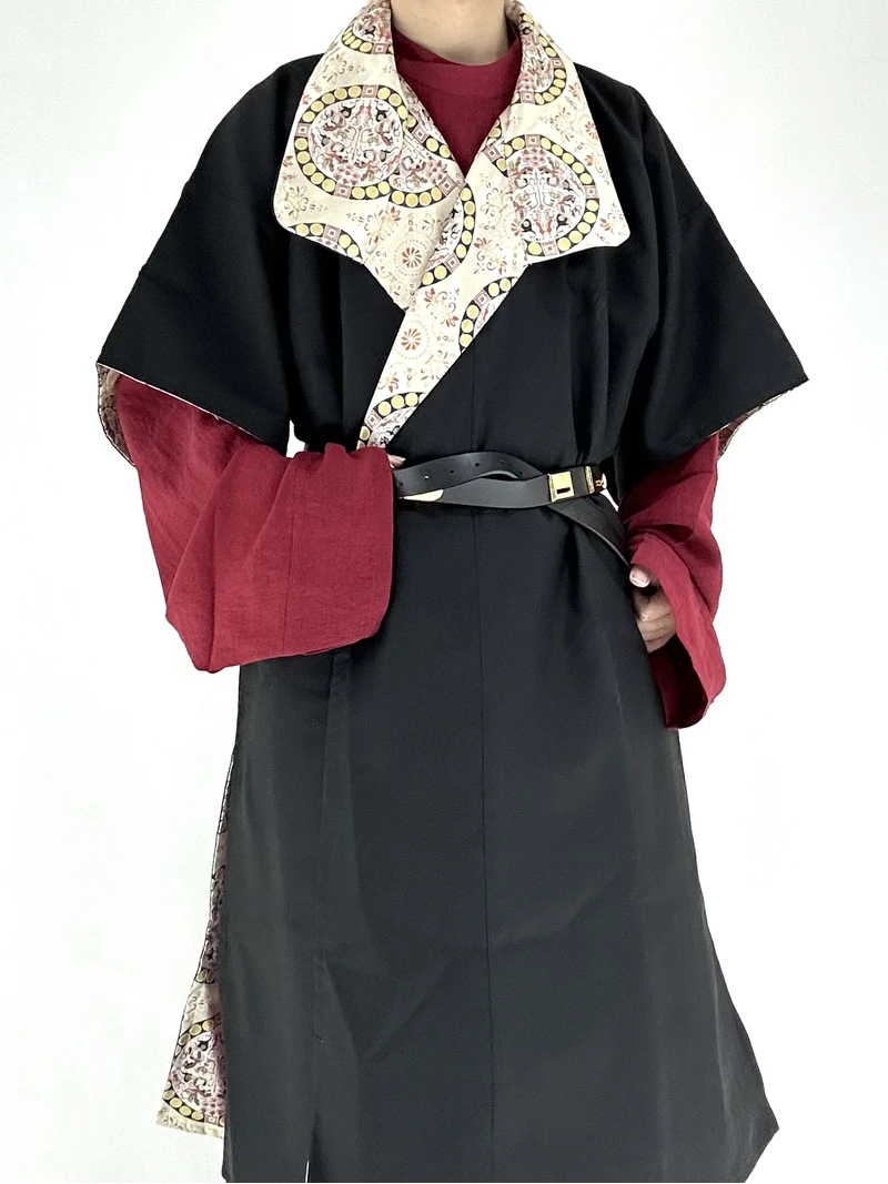 Crafted from high-quality polyester brocade, it offers a smooth drape, refined sheen, and historical charm. The stand collar and open-front design reflect classic Tang tailoring, while the reversible construction adds modern practicality.