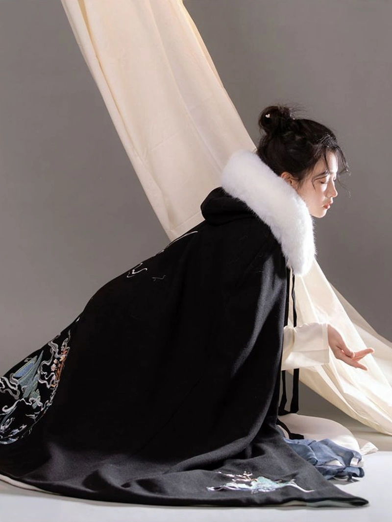 Embrace traditional elegance with this Black Embroidered Woolen Cape. Crafted from soft woolen fabric with a thick coral fleece lining, it features a luxurious faux fox fur collar and exquisite embroidery of auspicious cranes and cloud patterns. Perfect for autumn and winter, this flowing cape combines warmth, comfort, and classic Chinese style for festive occasions or stylish everyday wear.