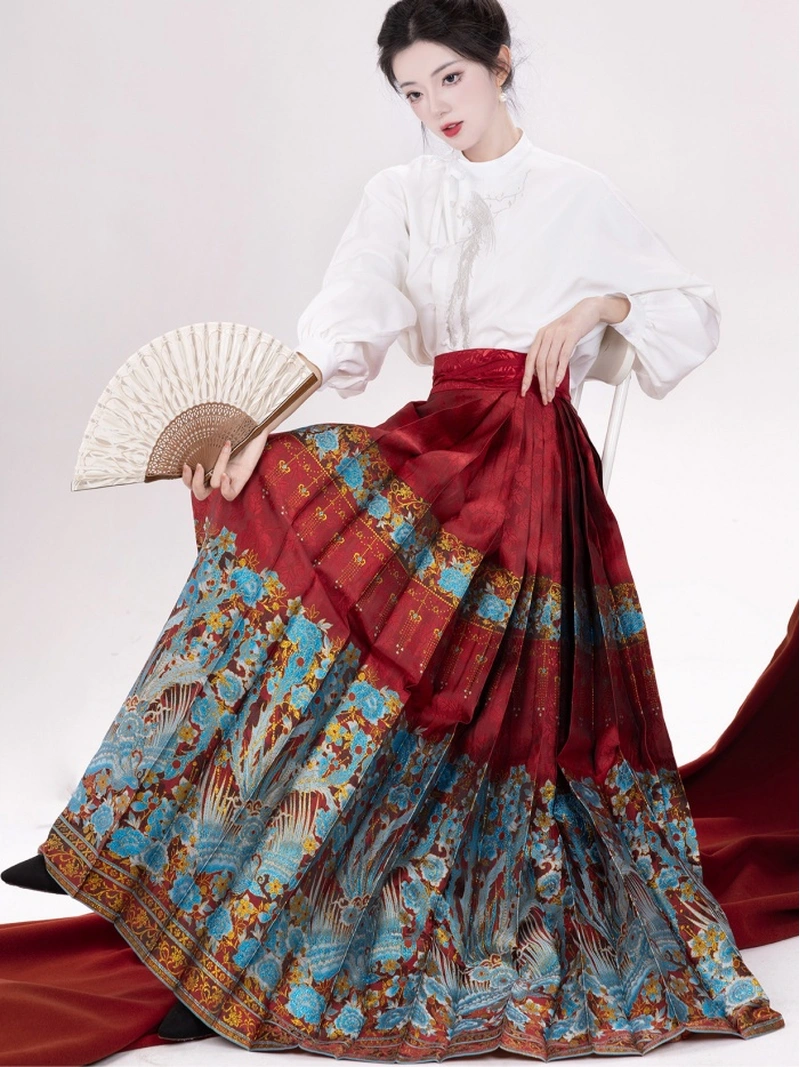Inspirada na técnica tradicional Dian Cui (arte de penas de martim-pescador), esta Dinastia Ming-O estilo Mamian Qun reinterpreta o brilho do artesanato clássico através da cor e do padrão, em vez de penas.