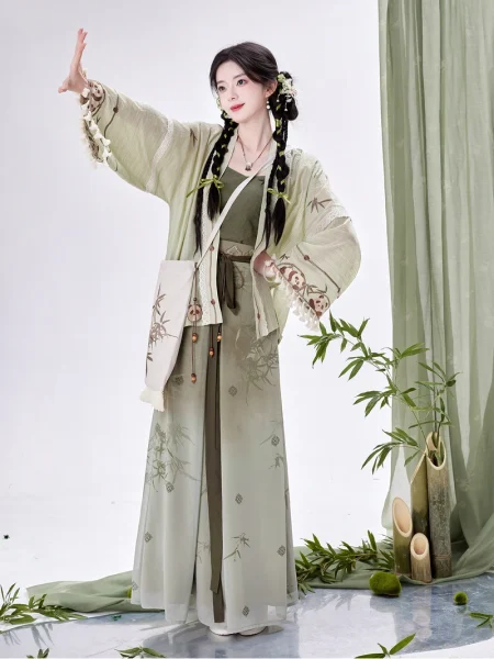 Song Dynasty Hanfu “Green Bamboo & Panda” Set – Short Shirt, Triple Pleated Skirt, Camisole & Drawstring Bag