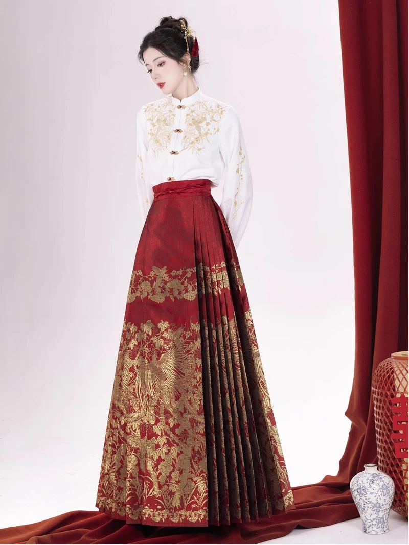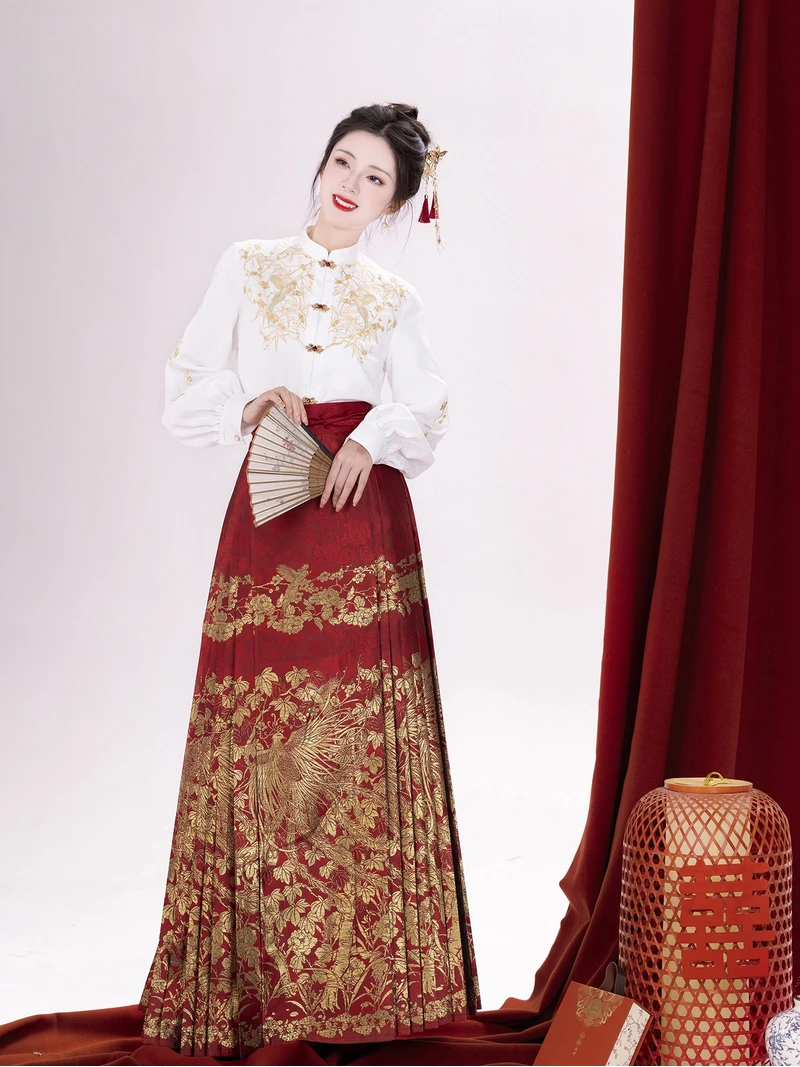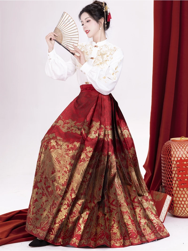 Den röda crossover-skjortan med stående krage är tillverkad i jacquardtyg med fint broderi med plommonblommor, medan manschetterna är prydda med guld- och rödfärgade knappar symboliserar festlig elegans. Den guldbroderade Ma Mian Qun (plisserad kjol med hästansikte) funktioner mönster av fenix, plommonblomma och pion, och blandar vintage charm med modern lyx. I skiftande ljus skimrar brokaden graciöst - perfekt för engagemang, bröllop, Nyårsfirande, eller elegant vardagsklädsel.