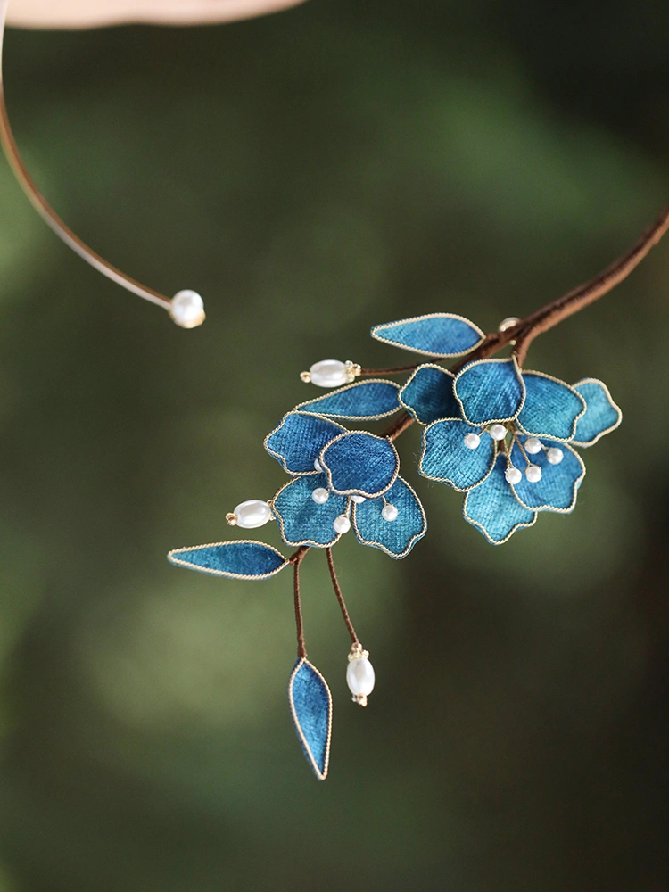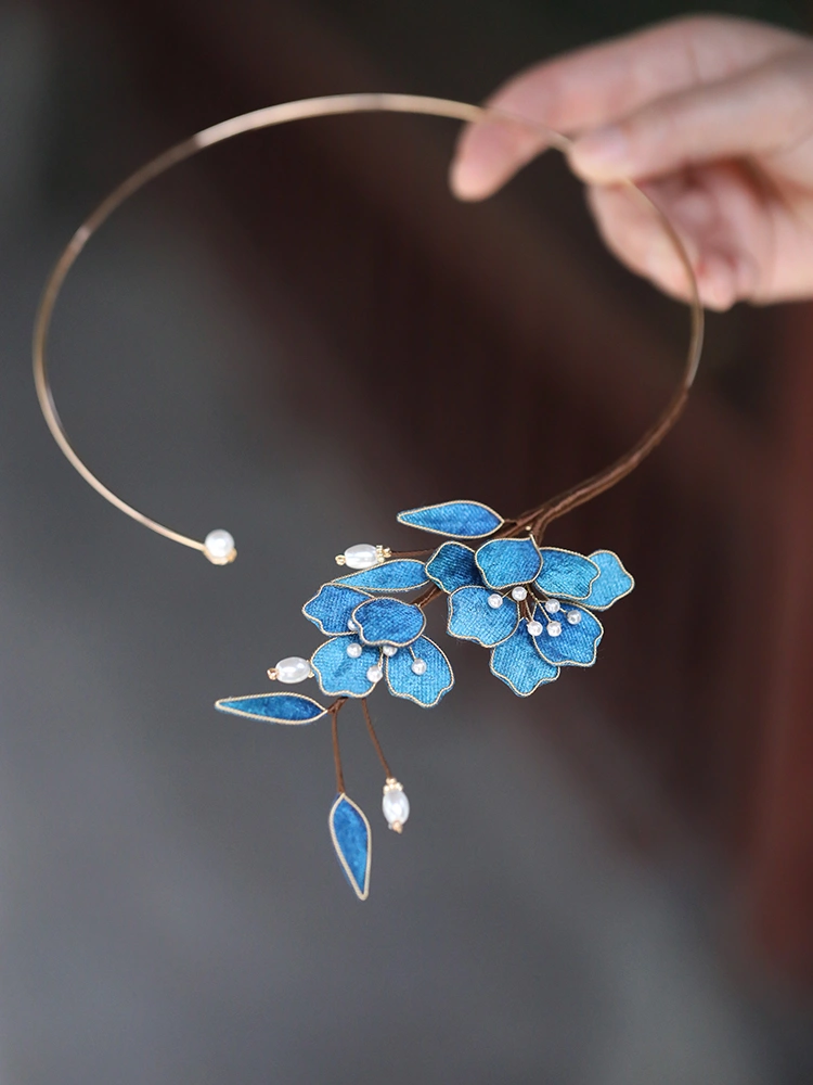 สร้อยคอโชกเกอร์ลายดอกไม้สีน้ำเงินวินเทจแบบจีน