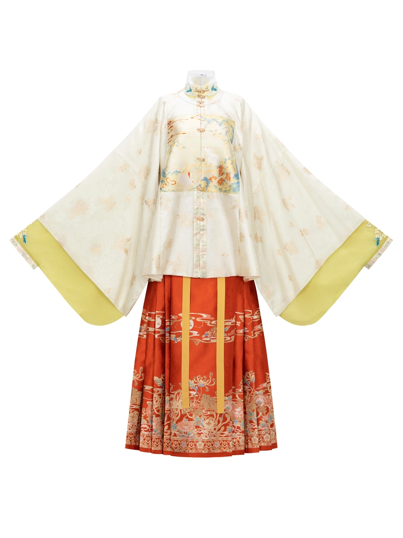 เสื้อคลุมคอกลม (สีแอปริคอต): ทอด้วยผ้าแจ็คการ์ดและลายด้ายสีทองที่ออกแบบเอง แผงจินบูจื่อแสดงภาพกระต่ายหยกกำลังมองพระจันทร์ ซึ่งเป็นลวดลายกลางฤดูใบไม้ร่วงอันเป็นเอกลักษณ์