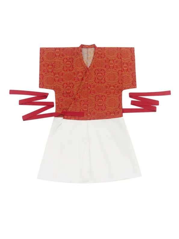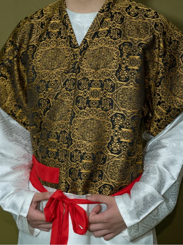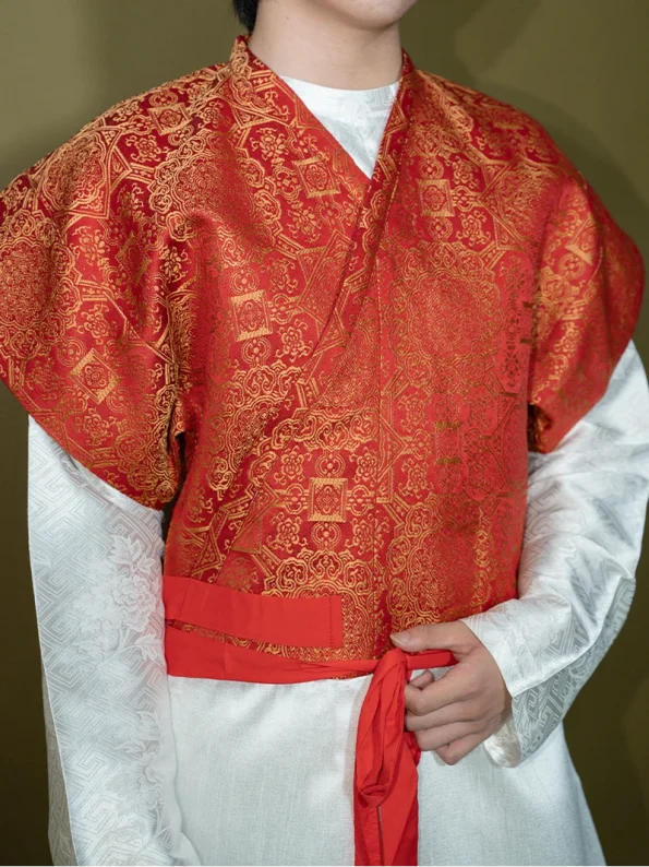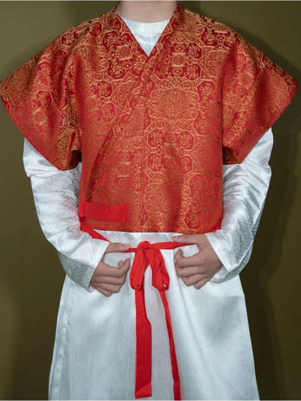 Made from luxurious brocade fabric with a golden sheen, the garment presents a refined contrast between the vibrant red main body and subtle white inner robe. The rich woven texture and gold-thread detailing capture the splendour of Tang Dynasty artistry, blending elegance with cultural heritage.