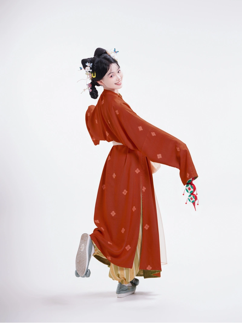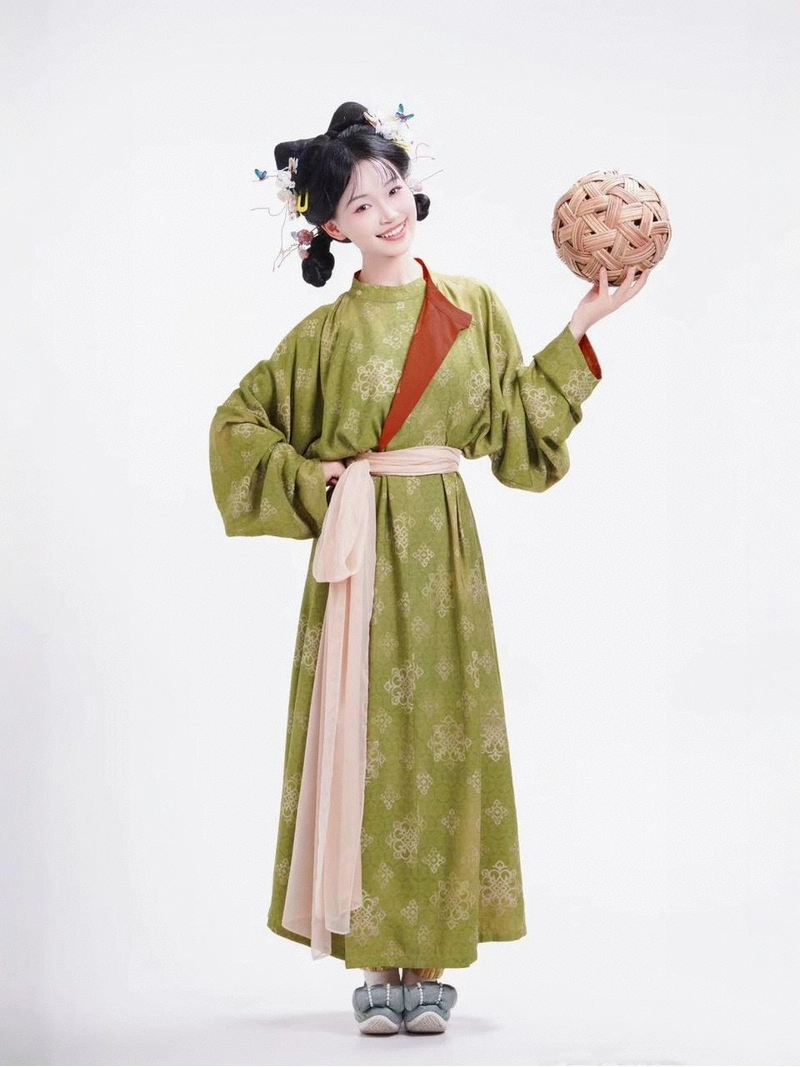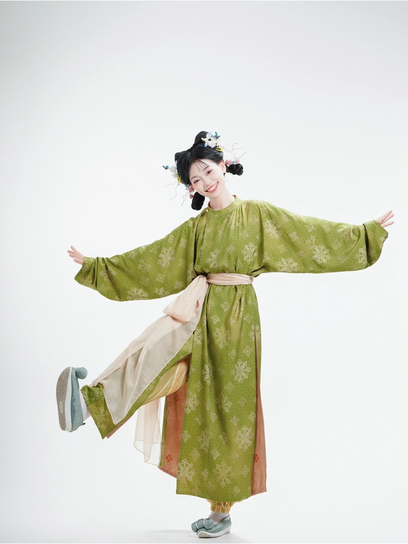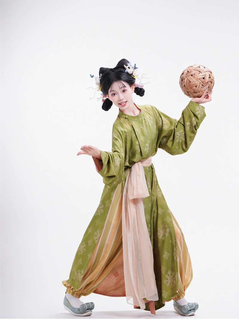 นี้ สไตล์ถัง ชุดฮั่นฝูที่ได้รับการบูรณะใหม่นั้นทำจากผ้าเรยอนซึ่งขึ้นชื่อในเรื่องเนื้อสัมผัสที่อ่อนโยนต่อผิวและการตกแต่งที่ประณีตหลังจากการขัดเงาและปรับสีซ้ำแล้วซ้ำเล่า หยวนหลิงเปา (เสื้อคลุมคอกลม) โดดเด่นด้วยดีไซน์ทูโทนที่สามารถกลับด้านได้ มีให้เลือกทั้งสีแดงและเขียว หรือสีชมพูและเขียว มอบความสบายและความพลิ้วไหวอย่างเหนือระดับ กางเกงขายาวลายทางสีเหลือง-เขียว แบบชั้นเดียว ไม่มีซับใน ส่วนใหญ่เป็นแบบทึบแสง ด้านข้างมียางยืดเพื่อความสบายและคล่องตัว เหมาะสำหรับทั้ง ผู้ชายและผู้หญิงชุดนี้ผสมผสานแรงบันดาลใจทางประวัติศาสตร์กับสไตล์โมเดิร์น
