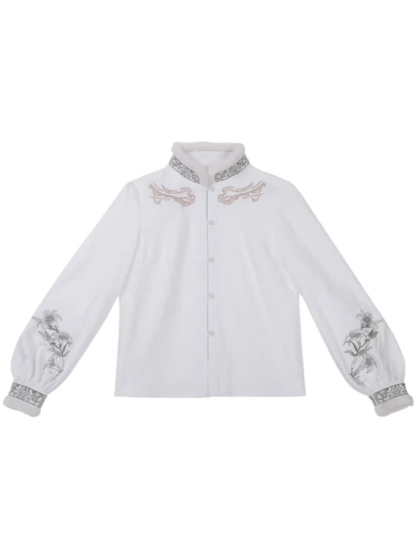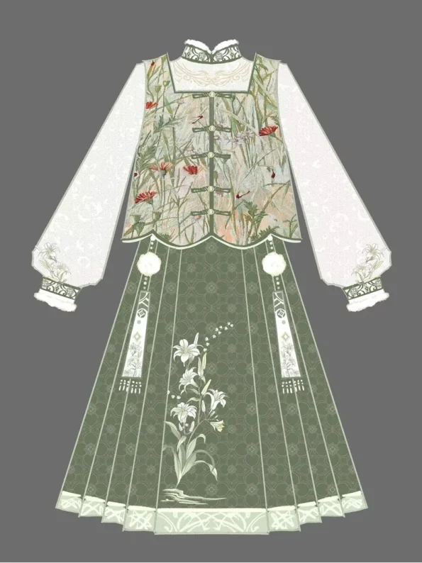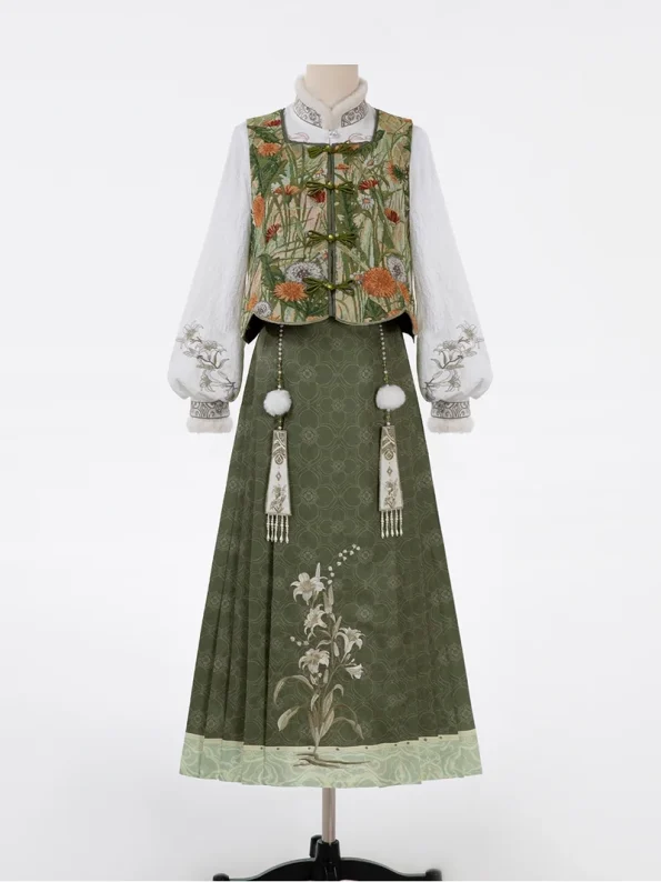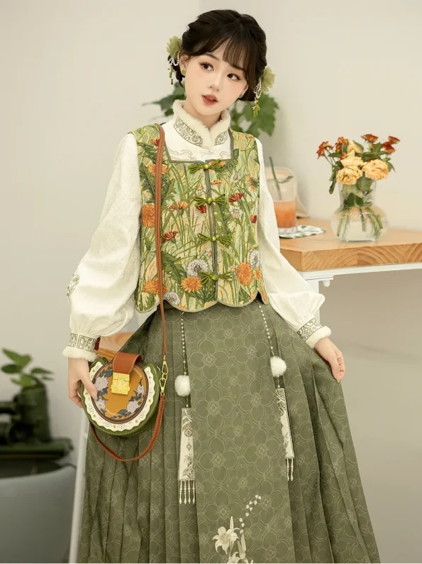 Cái này Bộ ba món phong cách Trung Quốc mới Kết hợp sự sang trọng hiện đại với nét duyên dáng nhẹ nhàng của thời trang lấy cảm hứng từ Hanfu. Bộ trang phục bao gồm một Áo cổ đứng, một Áo vest Jacquard, và một Ma Mian Qun (váy mặt ngựa), Tạo nên một dáng vẻ thanh lịch và nhiều lớp, hoàn hảo cho mùa thu và mùa đông.
