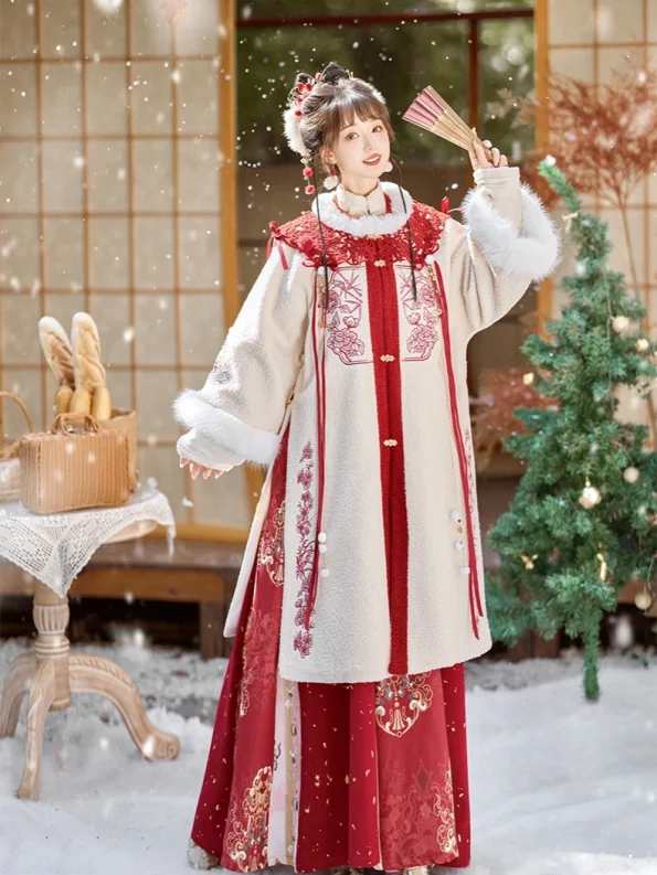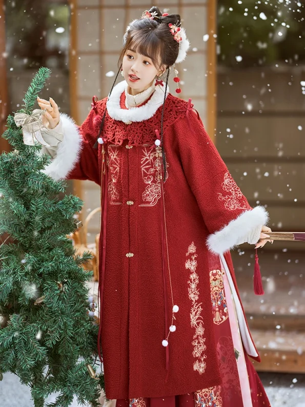 为您的衣橱增添节日的优雅气息。 明朝-秋冬灵感 汉服 套装。红色的长鳌衣上绣有竹子、菊花、梅花、蝴蝶、兰花和喜庆的鼓图案,十分精美。可拆卸的云肩上有剪纸效果的图案,增强了文化艺术感,打造出优雅夺目的造型。.