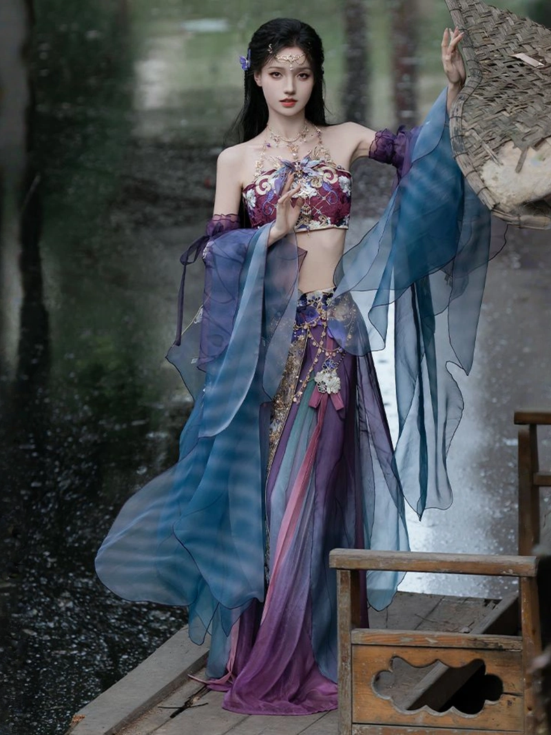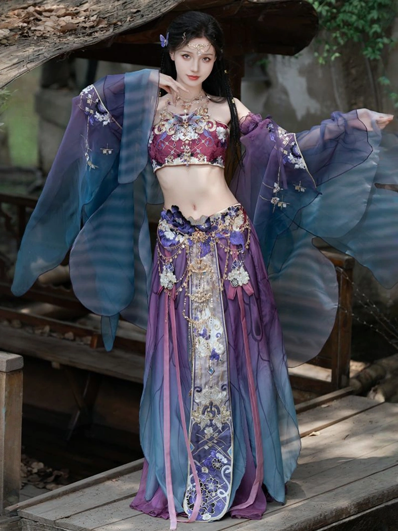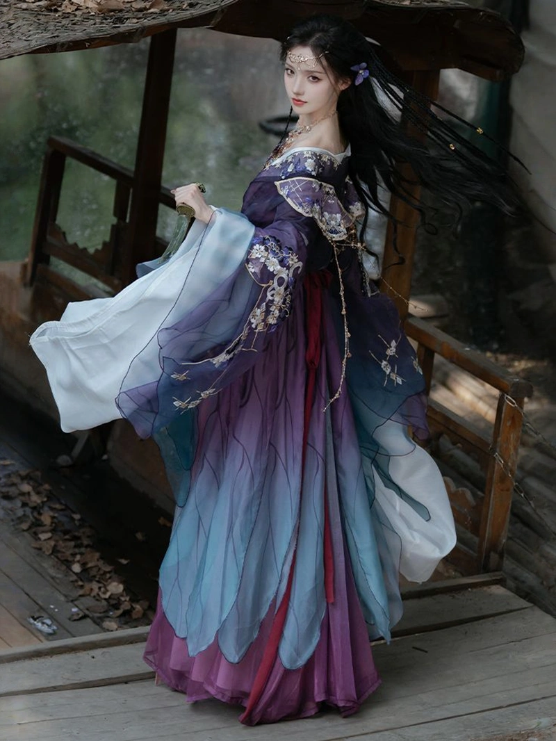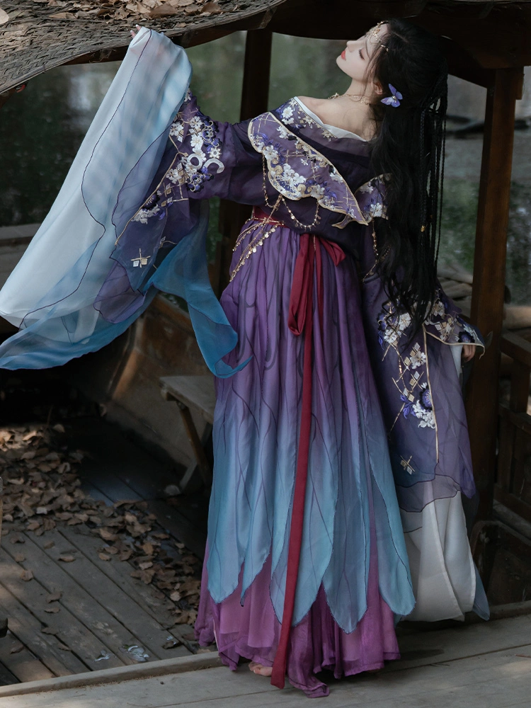 这套典雅的汉服从南北朝时期汲取灵感,雍容华贵的绮罗裙搭配精致的刺绣。精致的刺绣图案增添了一丝纯洁和优雅,宽袖设计透气通风,非常适合春夏穿着。飘逸的裙摆营造出奢华空灵的廓形,适合日常穿着、文化活动或舞台表演。.