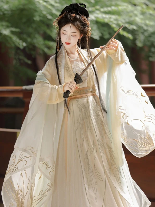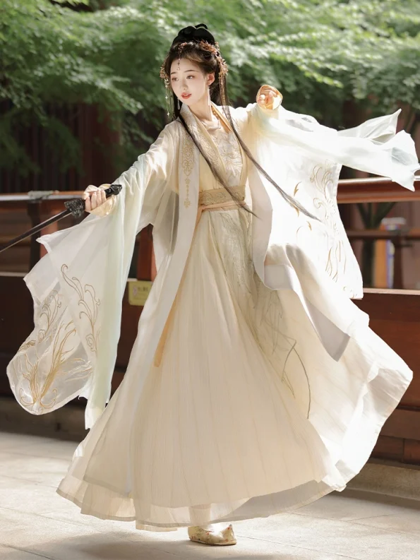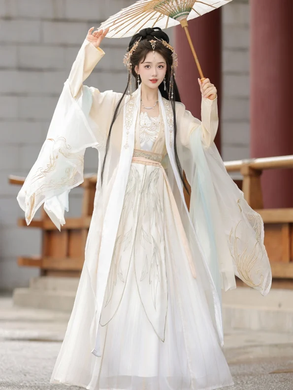 这款精美的 宋朝 风格 逍遥群 套装这套套装采用柔软的米色涤纶面料制成,精致的刺绣增添了一丝仙子般的优雅。套装包括一件飘逸的大袖外袍、一件合身的上衣、一件吊带衫和一条高腰裙(逍遥群),将传统设计与现代舒适完美融合。无论是日常穿着还是出席文化场合,这套精致的服装都能为您的衣橱带来永恒的美丽和精致。.