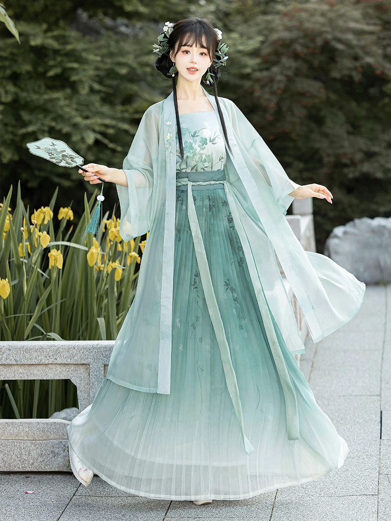 此款中式礼服彰显中国传统时尚的优雅气质。 宋朝 风格的汉服套装,非常适合春夏穿着。这套服装以轻盈飘逸的贝子为特色,搭配飘逸的逍遥群,设计出优美的轮廓。它采用柔软透气的聚酯纤维制成,无论是日常穿着、文化活动还是拍摄照片都非常舒适。吊带衫、贝子和裙子的组合既能捕捉古代美学的魅力,又能轻松应对现代场合。.