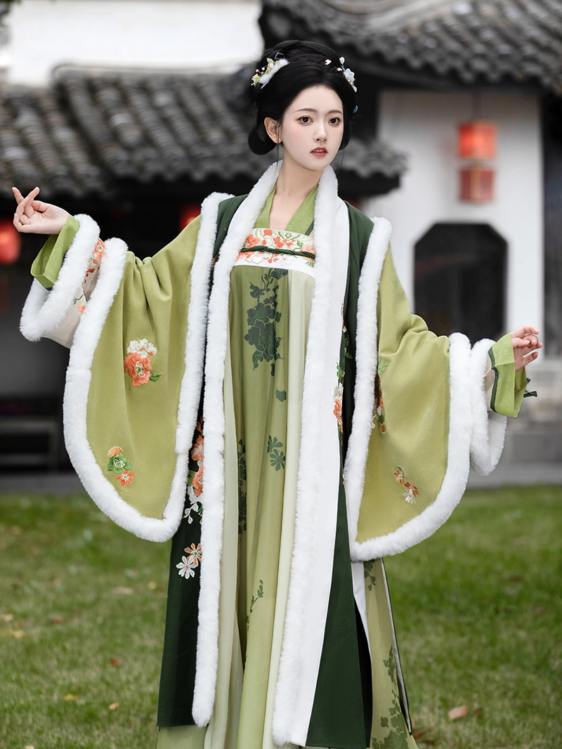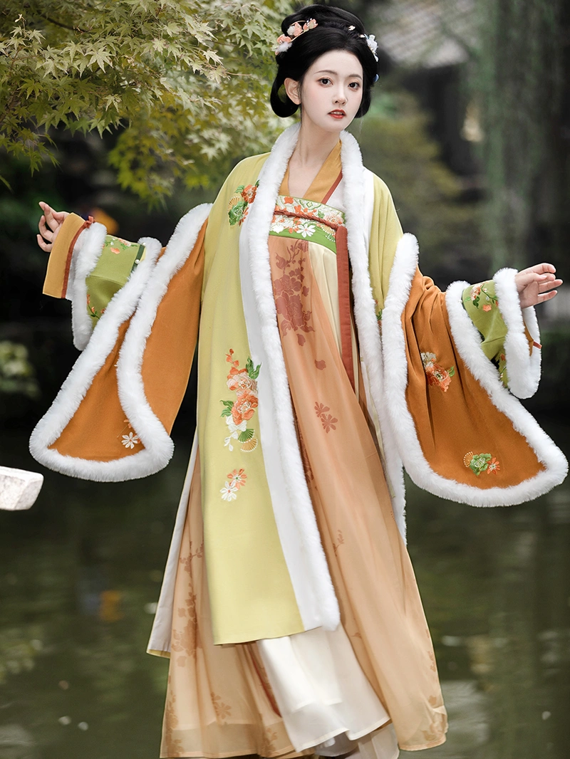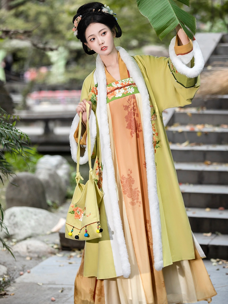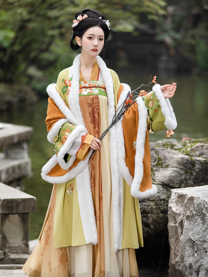 唐朝 这套灵感源自冬季汉服的套装具有丰富的 绣花 启雄群 (高腰裙) 搭配保暖外袍和内衣。该套装采用 55% 棉和 45% 其他材料混纺的长毛绒面料,舒适优雅,适合秋季和冬季日常穿着。 冬季. .复杂的刺绣和传统的设计元素使其成为汉服爱好者的首选,既保暖又不失时尚。.