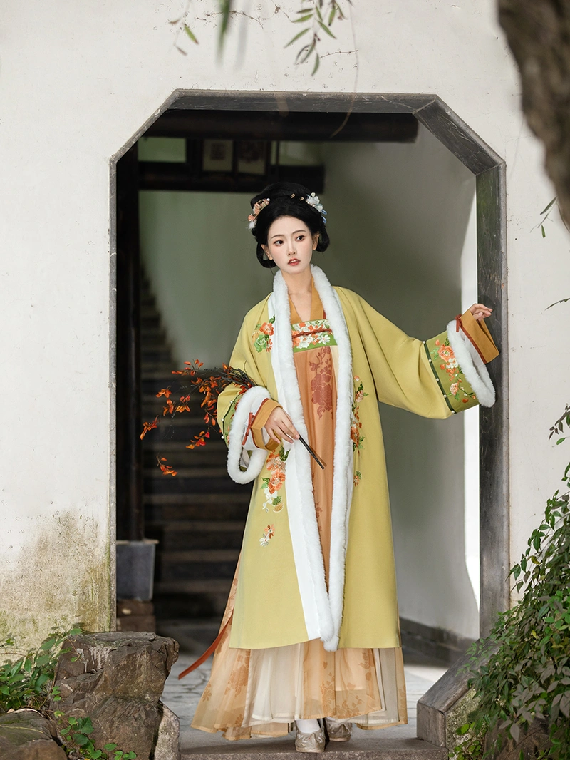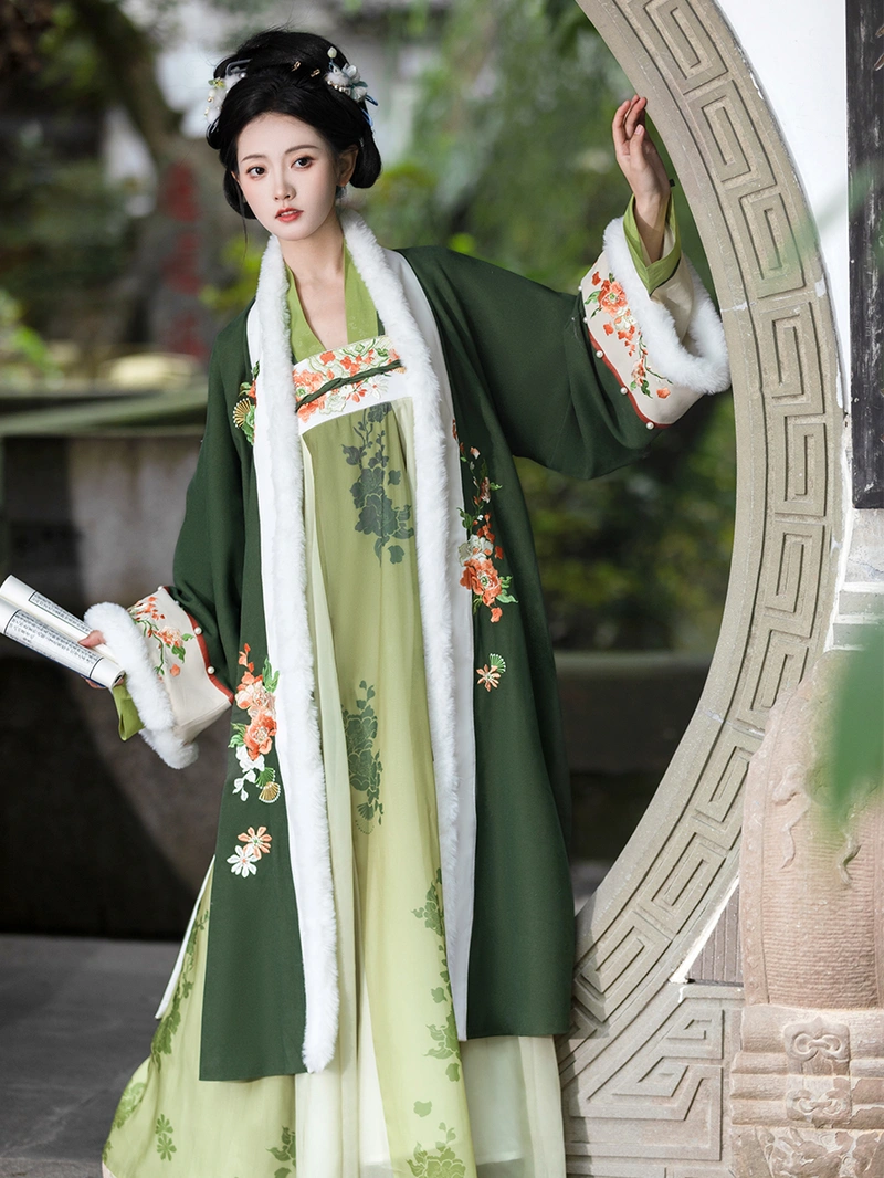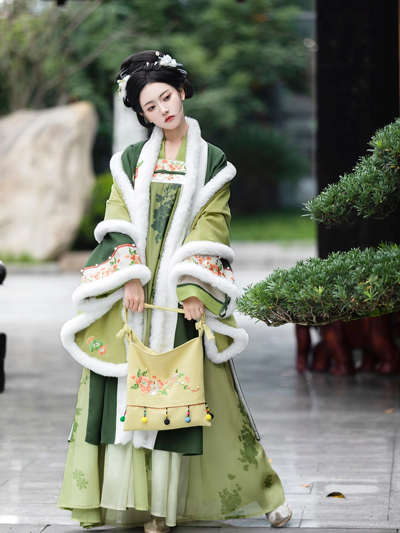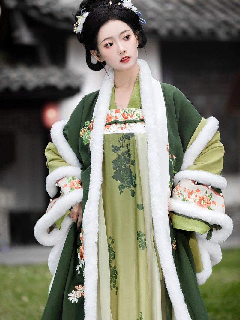 唐朝 这套灵感源自冬季汉服的套装具有丰富的 绣花 启雄群 (高腰裙) 搭配保暖外袍和内衣。该套装采用 55% 棉和 45% 其他材料混纺的长毛绒面料,舒适优雅,适合秋季和冬季日常穿着。 冬季. .复杂的刺绣和传统的设计元素使其成为汉服爱好者的首选,既保暖又不失时尚。.