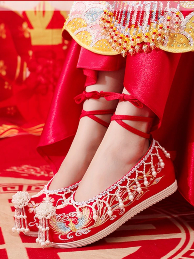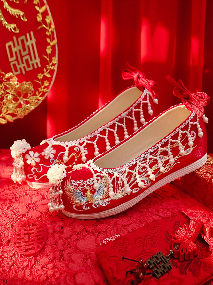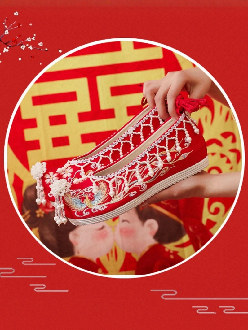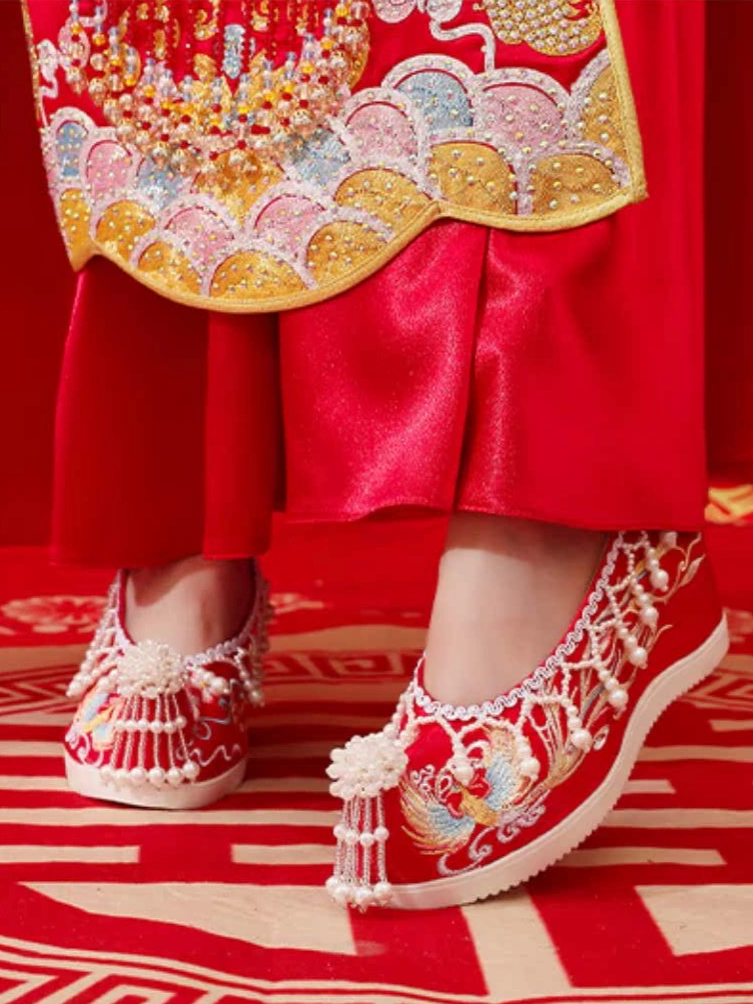 风格 手工制作的传统中式婚鞋,配以复杂刺绣和珍珠点缀