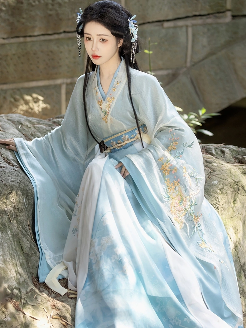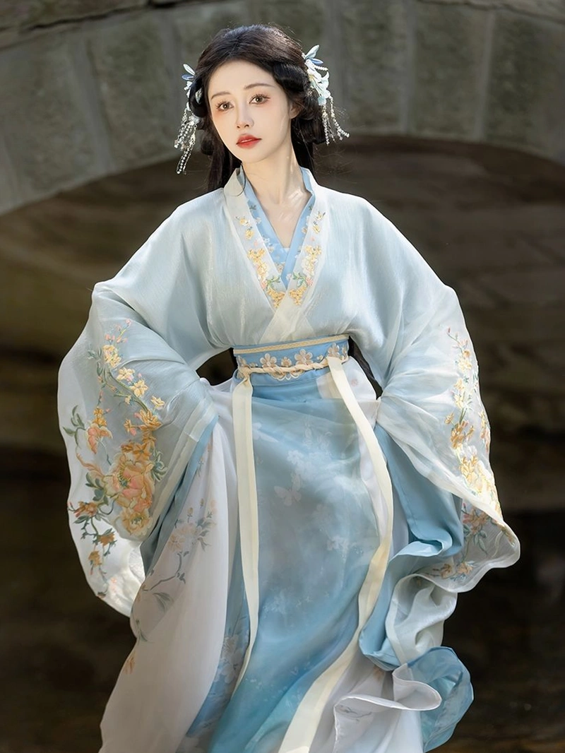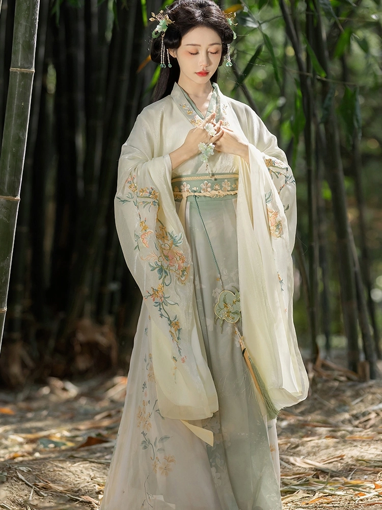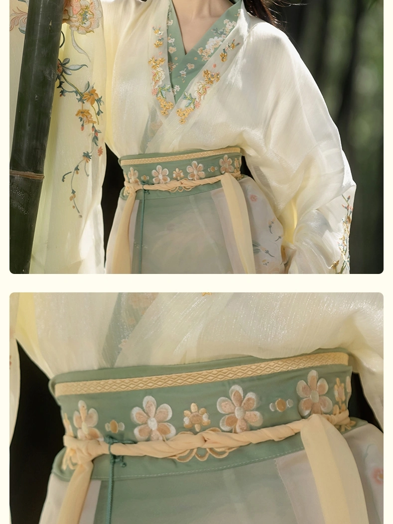 这套魏晋南北朝风格的汉服套装,让您走进古代中国的优雅生活。飘逸的宽袖,精致的褶皱,纤细的腰身,雍容华贵。 刺绣品, 这套服装采用了涤纶面料和经典的逍遥群,展现了传统宫廷服饰的精致之美。柔软的涤纶面料具有优美的垂感,同时确保日常穿着或特殊文化活动的舒适性。内外宽袖长袍的分层设计增加了层次感和精致感,非常适合节日庆典、摄影、舞台表演或个人收藏。.