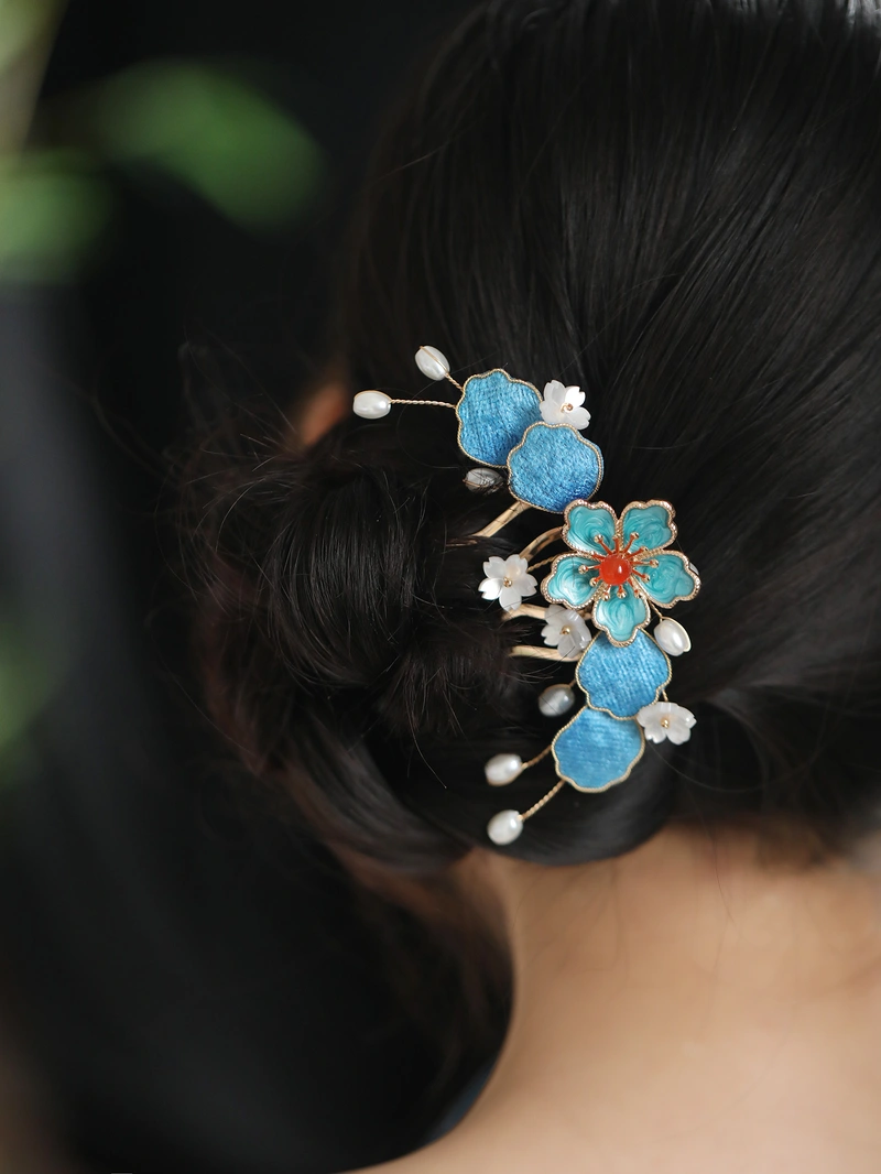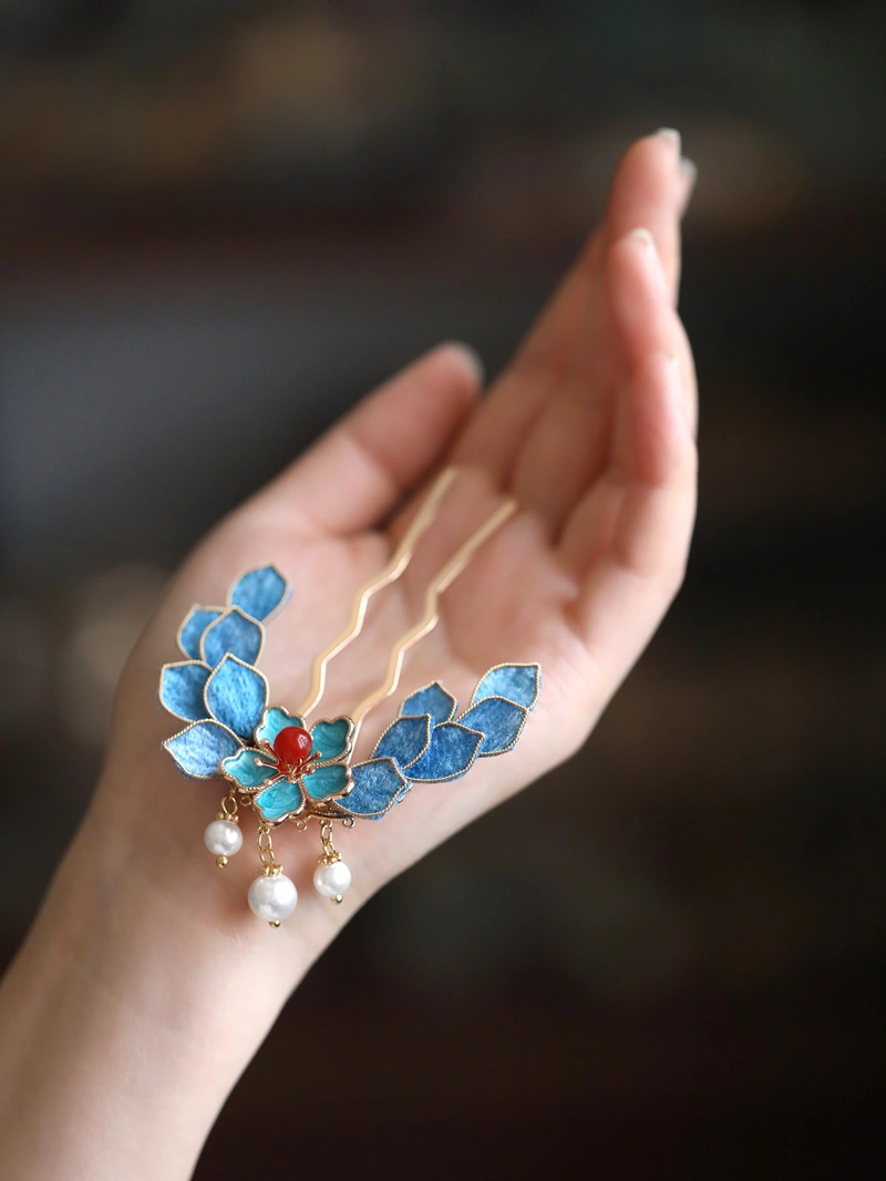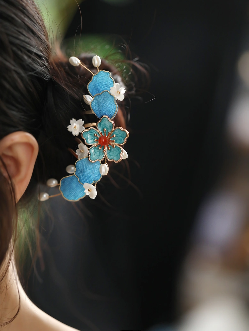 這款藍色手工花絲髮簪的靈感來自清朝和漢朝的典雅風格,以精緻的工藝和傳統中國藝術為特色。它展示了精緻的絲織工藝和複雜的花卉設計,是為您的漢服或旗袍服裝增添一抹歷史魅力的完美之選。這款髮簪融合了文化傳統與永恆之美,是日常佩戴或特殊場合的理想之選。.