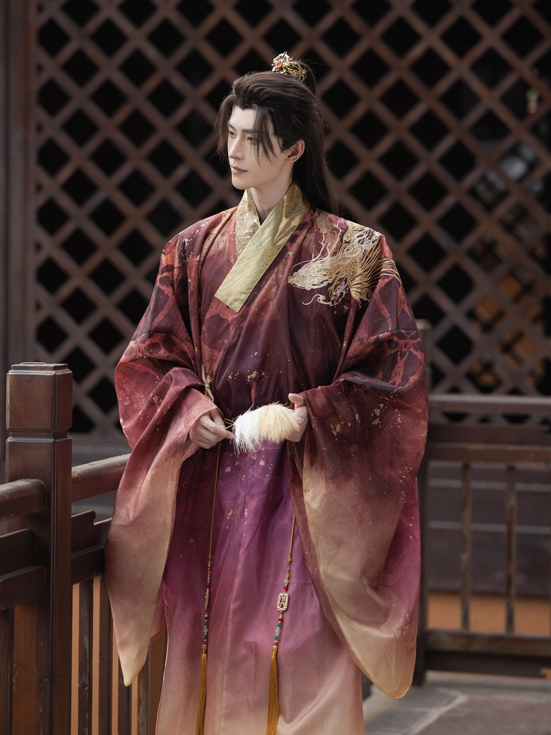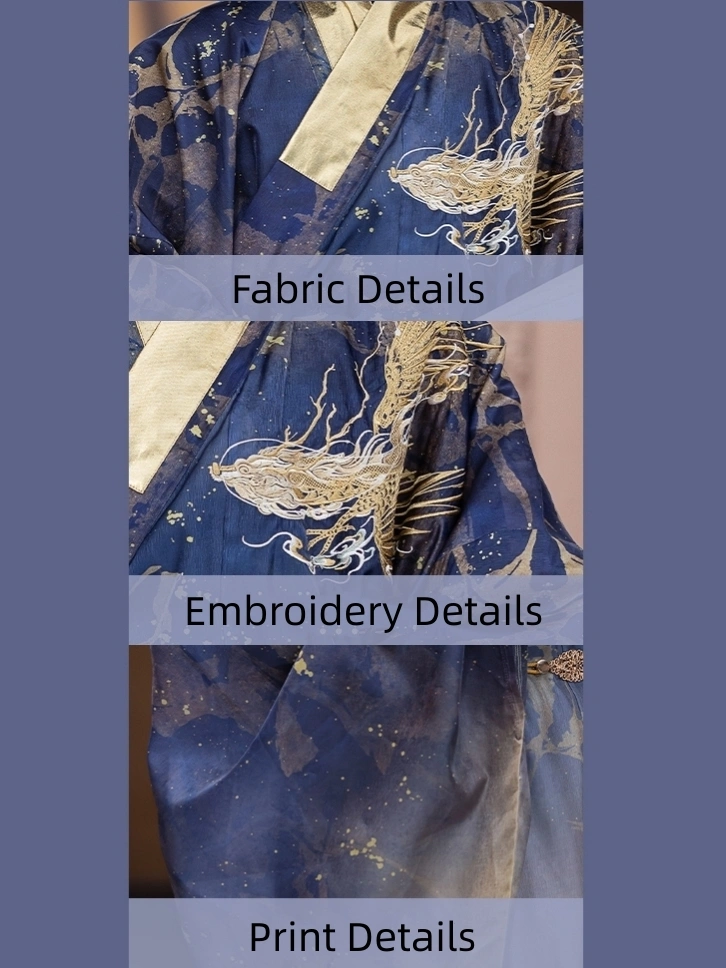 靈感來自傳統 明朝 這款大寶旗袍融合了古典優雅與精湛工藝。採用樹皮紋理的褶皺聚酯纖維製成,藍色和黃色的微妙漸變喚起神秘感和精緻感。長袍上綴有精緻的 繡花 龍 此款漢服的繡花圖案與印花圖案,增添了莊嚴與動感。腰部的流蘇更增添了其高貴的氣質,是漢服愛好者、收藏家或任何追求高貴、搶眼傳統造型的人的理想選擇。.