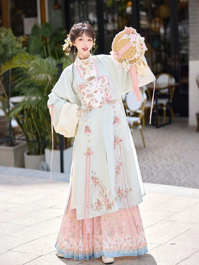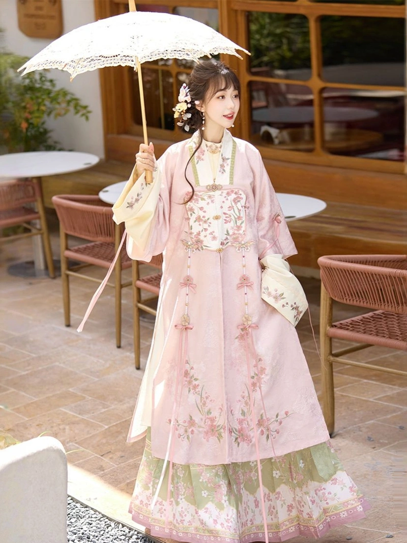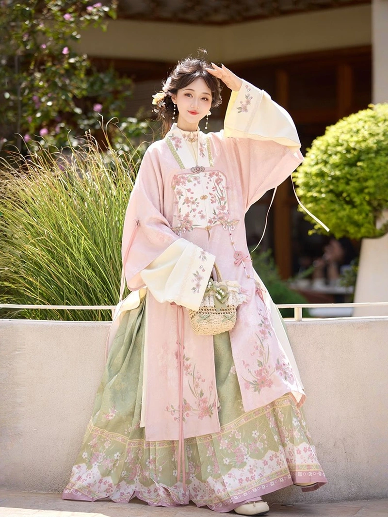 探索美麗的 明朝 刺繡 馬面群 漢服套裝, 這是一款優雅的傳統中式禮服,靈感來自經典的明式時裝。這款優雅的刺繡漢服採用輕盈的聚酯纖維製成,配以精緻的花卉刺繡,將舒適與永恆的魅力融為一體。馬面群裙和多層次的上衣創造出飄逸的輪廓,非常適合節日慶典、文化活動、攝影和日常穿著。是漢服愛好者和任何喜愛中國歷史服飾人士的百搭單品。.