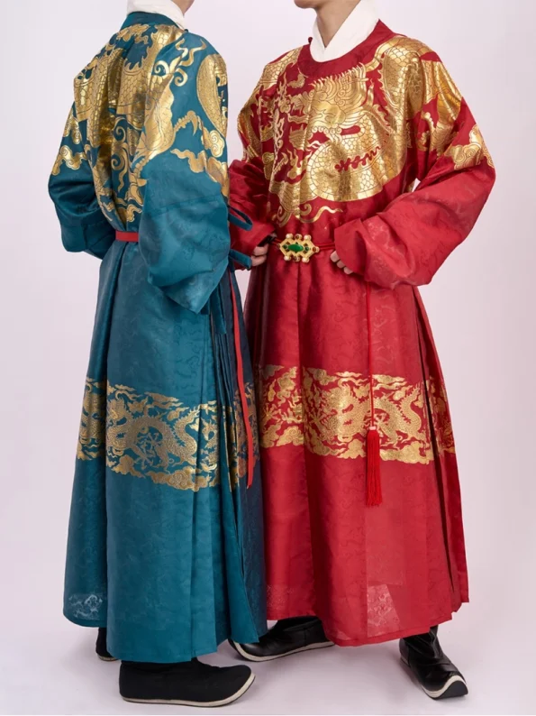這件圓領袍以閃爍的金線錦緞和褶皺剪裁捕捉了明朝皇室服裝的華麗氣派。袍子採用窄袖設計,既優雅又舒適,而金色織紋能反射出美麗的光線,創造出引人注目的視覺質感。.