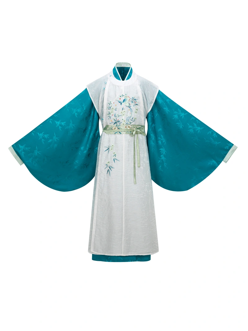這個 明朝 漢服系列提供三件獨立的單品:長背心、褲子、襪子。 知豆袍, 和腰帶。每件商品均獨立銷售,設計為 中性, ,男女皆宜。長背心以飄逸的天絲尼龍混紡布製成,搭配精緻刺繡,增添優雅氣質與層次感。知豆袍有紅色與藍色兩種顏色可供選擇,以提花圖案布料製成,採用傳統明式剪裁,適合單穿或搭配背心。繡有鳥類圖案的綠色腰帶,以提花布料製成,可突顯整體裝束。.