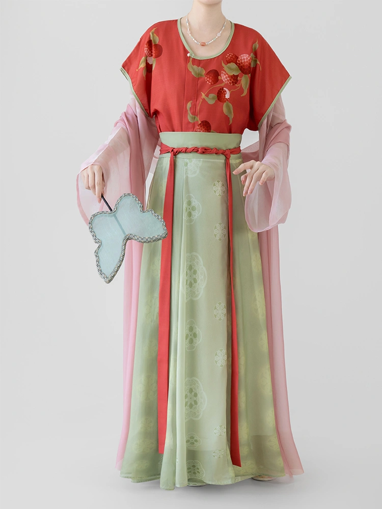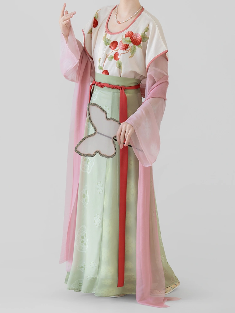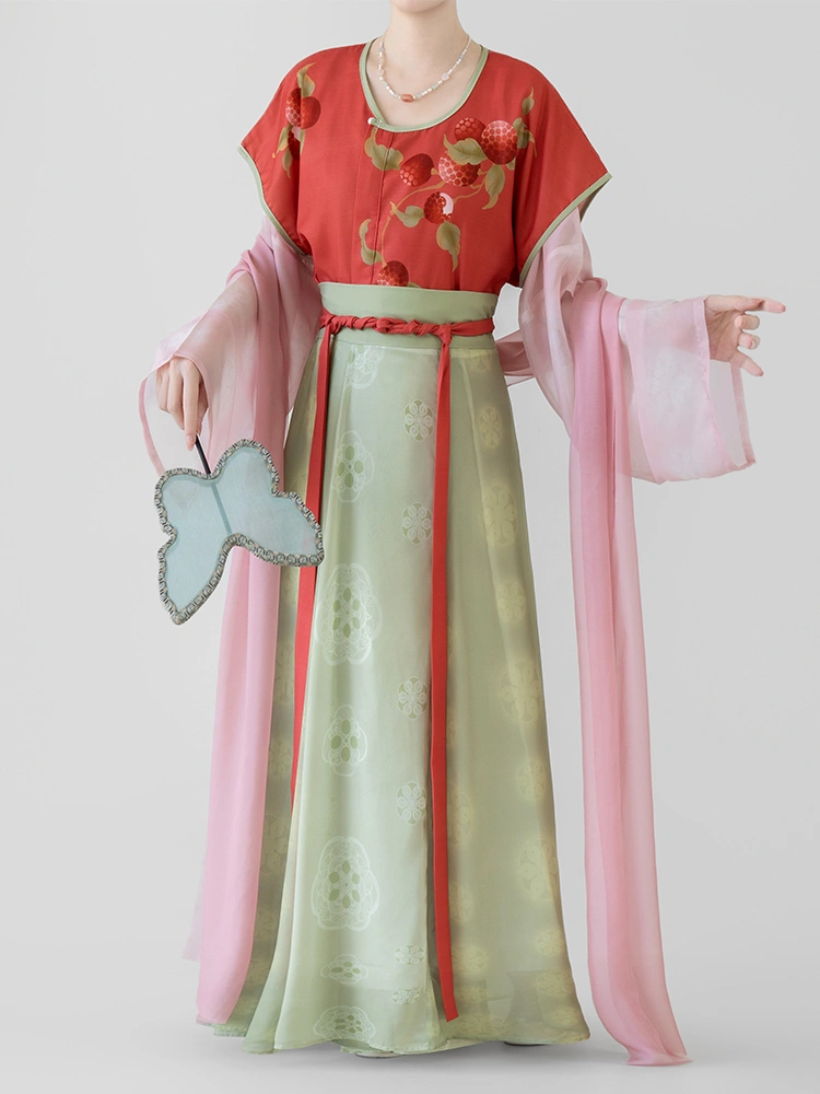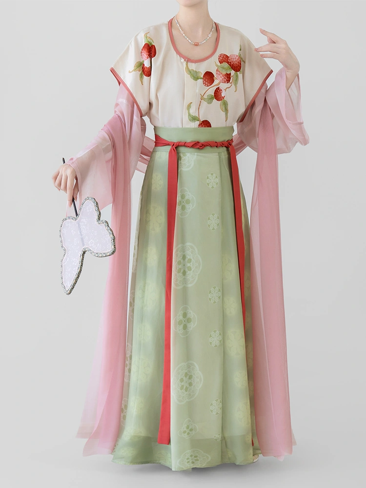 搭配這款 唐代印花北譏組, 此套裝是一套精美的漢服,非常適合春夏季的日常穿著。本套裝包括印花 Beizi 夾克、圓領內上衣、修身高腰褲 琦曜 短裙,以及飄逸的 Pibo 披肩.